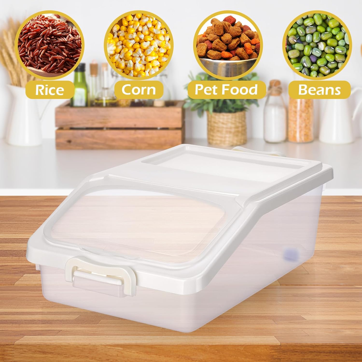 Features: Space saving and stackable: Each 11 lb capacity cereal container is designed to optimize shelf space, use them individually or group together for a streamlined, clutter-free pantry or storage room. Smart kitchen and pet companion: From baking supplies organizer to pet food bin with wheels, this storage container set brings functionality to every corner of your home—creating an efficient, clean, and orderly lifestyle for families and pet owners alike. Specifications: Material: PP Color: white Size: their dimensions are 12.99 x 9.45 x 5.31 inches / 33 x 24 x 13.5 cm, with the lid measuring 39 cm long (including the snap). Package includes: 3 x Food storage container 1 x Measuring cup Notes: Manual measurement, please allow slight errors on size. The color may exist a slight difference due to different screen displays