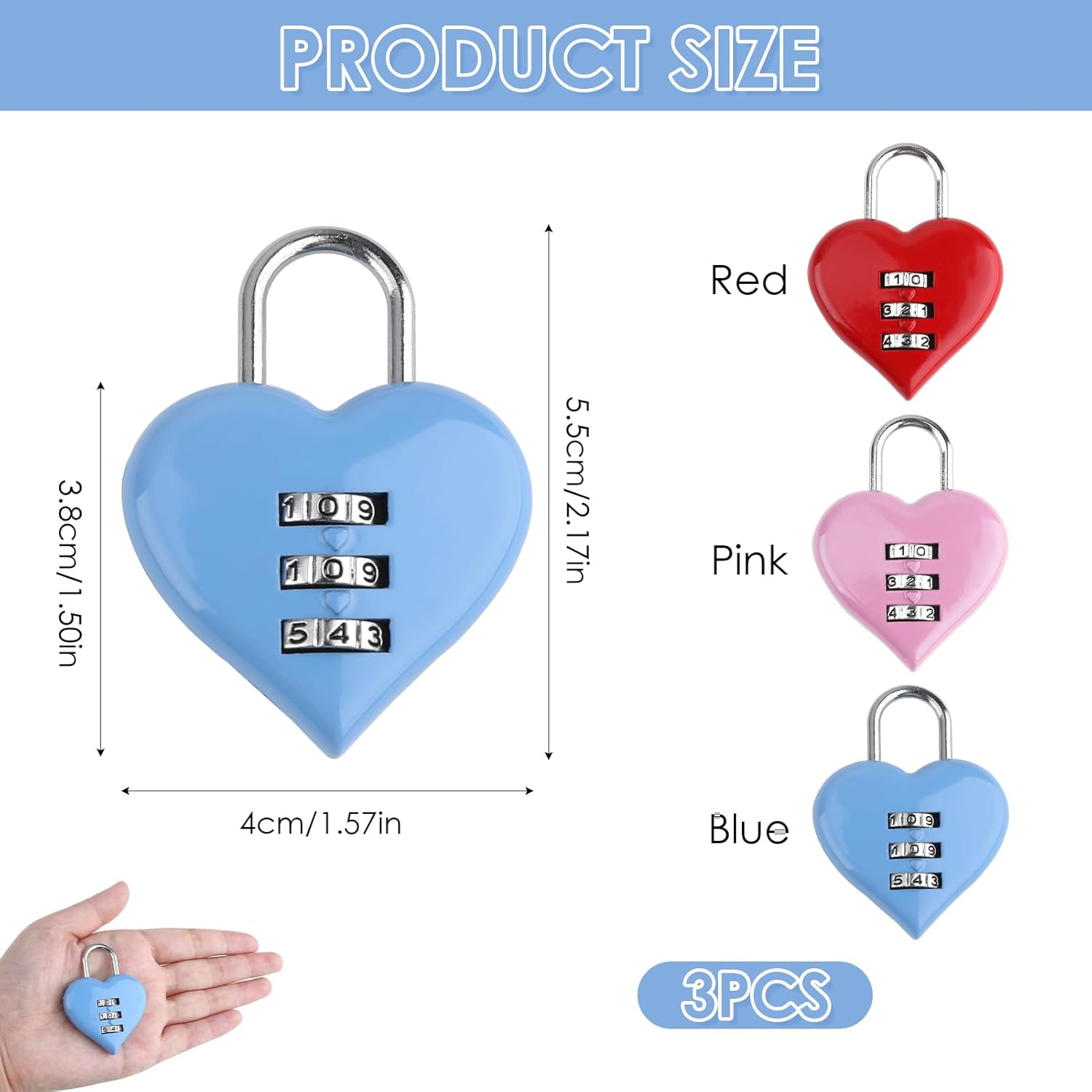 Add a touch of charm and security to your belongings with our 3-Piece Heart-Shaped Combination Padlock Set. Designed for girls and women, these cute mini locks offer a blend of style and functionality, perfect for safeguarding backpacks, lockers, luggage, and more. Crafted from durable zinc alloy, each padlock features a resettable 3-digit code, eliminating the need for keys and providing personalized security. The vibrant pink hue and heart shape add a delightful aesthetic, making these locks not only practical but also a fashionable accessory. Whether you're heading to school, the gym, or embarking on a journey, these compact and lightweight locks are your ideal companions. They also make thoughtful gifts for friends and loved ones, combining utility with a touch of whimsy. Secure your essentials with confidence and style using our Heart-Shaped Combination Padlocks.Material: Zinc alloy + shatter-resistant resinCombo Range: 000–999 (1,000 unique combinations)Package: 3 locksLost Keys: Keyless design means no frantic locker searches during class changes.Rusty Locks: Weatherproof alloy survives rainy campuses or humid beach trips.Gift Anxiety: Instantly charming packaging wows recipients without wrapping.Don’t settle for forgettable security!