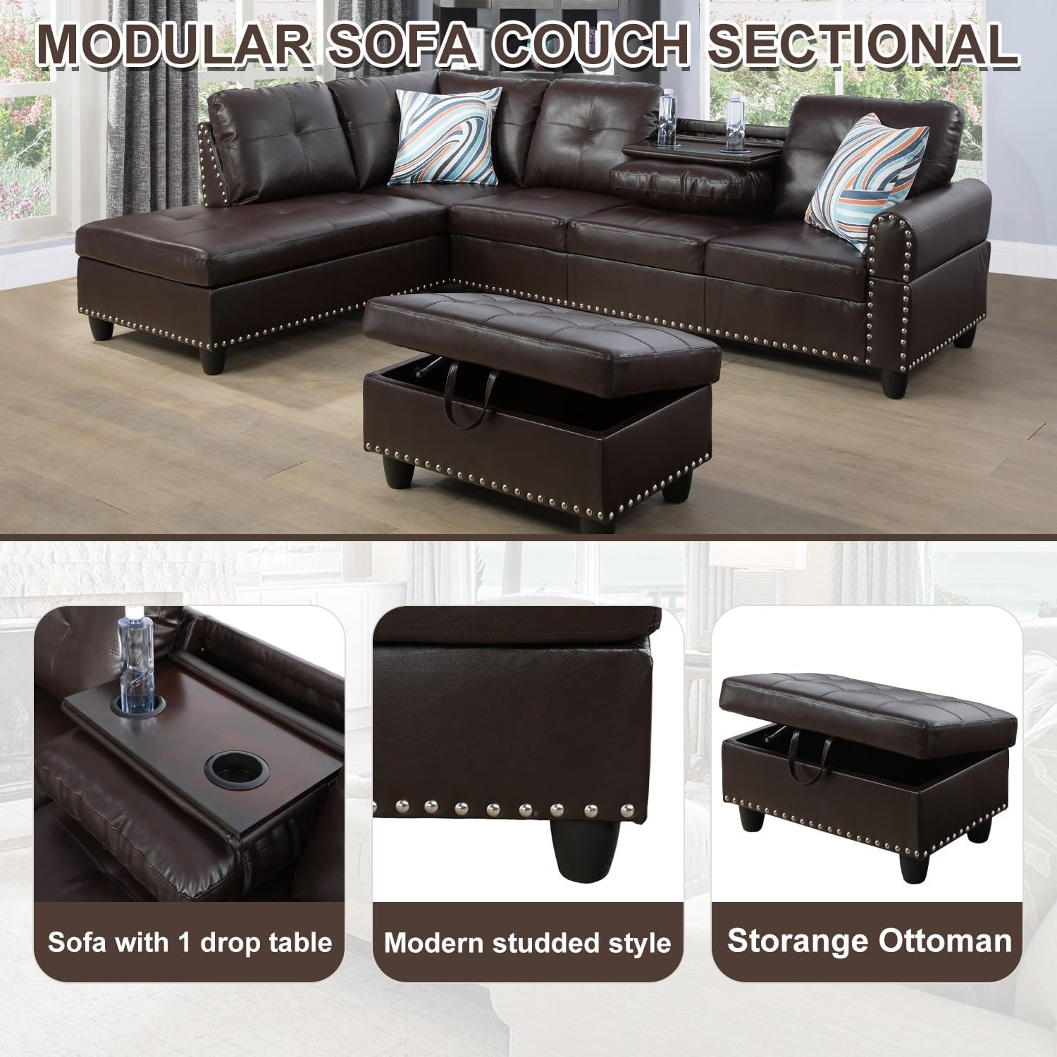 Our L-Shaped Modular Sectional Couch with Storage Ottoman is designed for ultimate convenience and style. The storage ottoman offers ample space to keep your living area organized, while the premium faux leather ensures a luxurious and durable finish. The sectional includes a foldable console with cup holders, making it easy to enjoy beverages and snacks without spills. With a modern button-tufted design and sturdy construction featuring thick foam cushions, a cozy chaise, a durable wood frame, and sleek metal feet, this sofa set seamlessly blends with traditional and contemporary décor, enhancing the elegance and comfort of any room.✨ 3-Piece Sectional Couch Sofas✨ Functional Storage Ottoman: Provides ample space for blankets, pillows, and other essentials, while also serving as additional seating or a footrest.✨ Premium Faux Leather: Offers a stylish and luxurious appearance, ensuring durability and easy maintenance.✨ Foldable Console with Cup Holders: Conveniently holds drinks and snacks, enhancing relaxation without the worry of spills.✨ Modern Luxurious Design: Showcases button-tufted upholstery with clean lines and elegant Brown faux leather, blending seamlessly with various décor styles.✨ Sturdy and Comfortable: Features thick foam cushions, a cozy chaise, a durable wood frame, and metal feet, providing a robust structure and unparalleled comfort.Sofas Couches SizeCouches Size(with armrest): 95.5"D*28.5W*32.5H, 79.4LBSChaise Size: 69.5"D*28.5W*32.5H, 75.9LBSOttoman Size: 28.5"D*19W*17.5H, 23LBSHeight of Armrest: 23"Width of Armrest: 6"Height of Feet: 5"Thickness of Frame: 6.5"Height of Seat: 17.5"Width of Seat: 20"Depth of Seat: 18.5"Height of Backrest: 15"Angle of Backrest: 110°~115°Sofas Couches InformationProduct Type: Sofa Couches SetProduct Name: Brown Faux Leather 3-Piece Sofa SetMain Color: BrownMain Material: Faux Leather Synthetic LeatherFill: FoamPackage Number: 3Assembly is required: Yes
