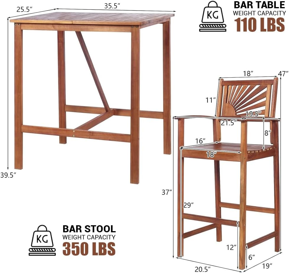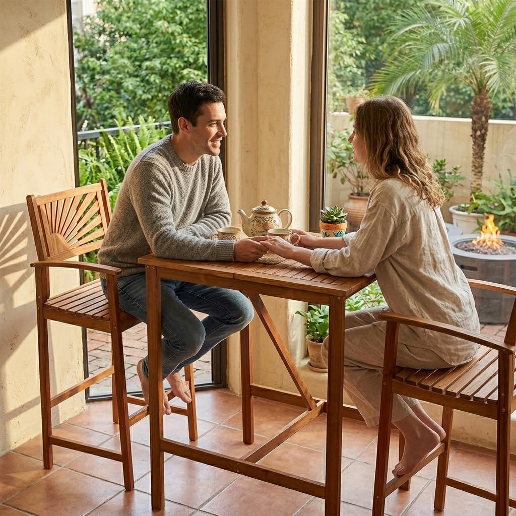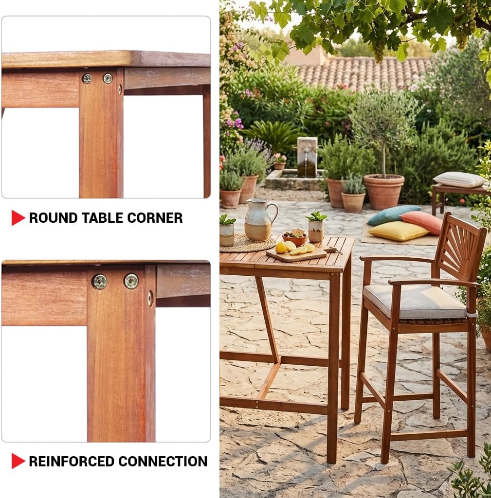 Elevate your leisure time with the LIVEVIE 3-Piece Acacia Wood Bar Set, a masterpiece of compact luxury. Designed for those who appreciate the finer details of outdoor living, this set combines the warmth of traditional woodwork with a functional, modern silhouette. The table stands at a perfect 39.5-inch height, creating a sophisticated "bistro" atmosphere whether you are enjoying a morning espresso on the balcony or hosting an intimate sunset dinner in the backyard. The LIVEVIE difference lies in the artisanal sunflower motif carved into the backrests, which adds a distinctive flair that standard outdoor sets lack. Measuring 35.5" x 25.5" x 39.5" overall, the set is substantial enough for daily use yet light enough at 53 lbs for easy repositioning. The 29-inch seat height is meticulously paired with the table to ensure optimal legroom and comfort. Whether you are outfitting a small apartment deck or a sprawling sunroom, LIVEVIE provides the durability, style, and space-saving smarts required for the modern home.