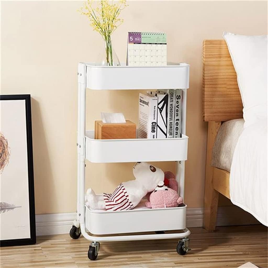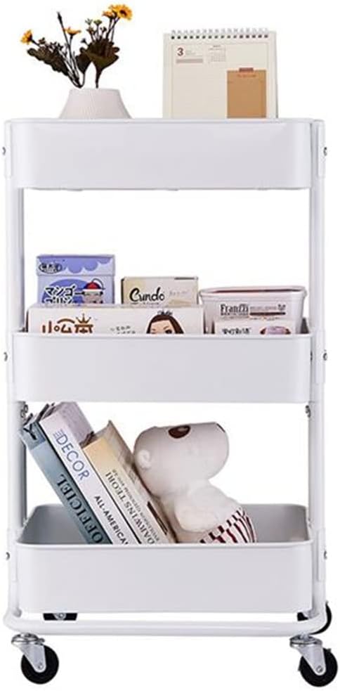 Features:1. CLEAR THE CLUTTER: The Utility Carts offer a versatile and attractive way to solve everyday essential storage and organization needs in your home, office, dorms, apartments, or any other spaces with limited storage and floor space2. FOR EVERY NEED: The all-purpose cart has endless uses, a great mobile book / study cart, file cart, bathroom storage, kids room toy storage, kitchen organizer, closet organizer, craft room storage, laundry room, cleaning supplies - it can even as a smaller serving cart when entertaining friends and family3. BUILT TO LAST: Constructed of heavy duty metal with an attractive rust-resistant powder coating, material and design for long-lasting use. 3 basket shelves with mesh bottoms allow for easy storage with breathability - air storage for clothes, books, or fruit / vegetable and dry food storage4. MOBILE STORAGE: Comes with 4 swivel caster wheels, a rolling utility cart that is easy to move from room to room in offices, garage, or workshops. 2 lock and release brake wheels to securely lock the cart into a preferred position or locationSpecifications:1. Product Dimensions: (17.13 x 12.99 x 29.13)" / (43.5 x 33 x 74)cm (L x W x H)2. Color: White/Blue/Black3. Material: Steel, Epoxy Powder Coating4. Care Instructions: Wipe Clean With A Soft Cloth Dampened With Water And A Mild Dish Detergent Or Soap, If Necessary5. Wipe Dry With A Clean ClothPackage includes:3-Tier Utility CartNoticeManual measurement has been used, there may be some reasonable errorDue to factors such as display equipment and shooting environment, the color of the item may be slightly different from the picture, which is a normal phenomenon, please refer to the actual itemEasy Assembly: Comes with clear instructions and tools for hassle - free setup. With rounded edges on baskets and an ergonomic height, this microwave table ensures safe, comfortable use