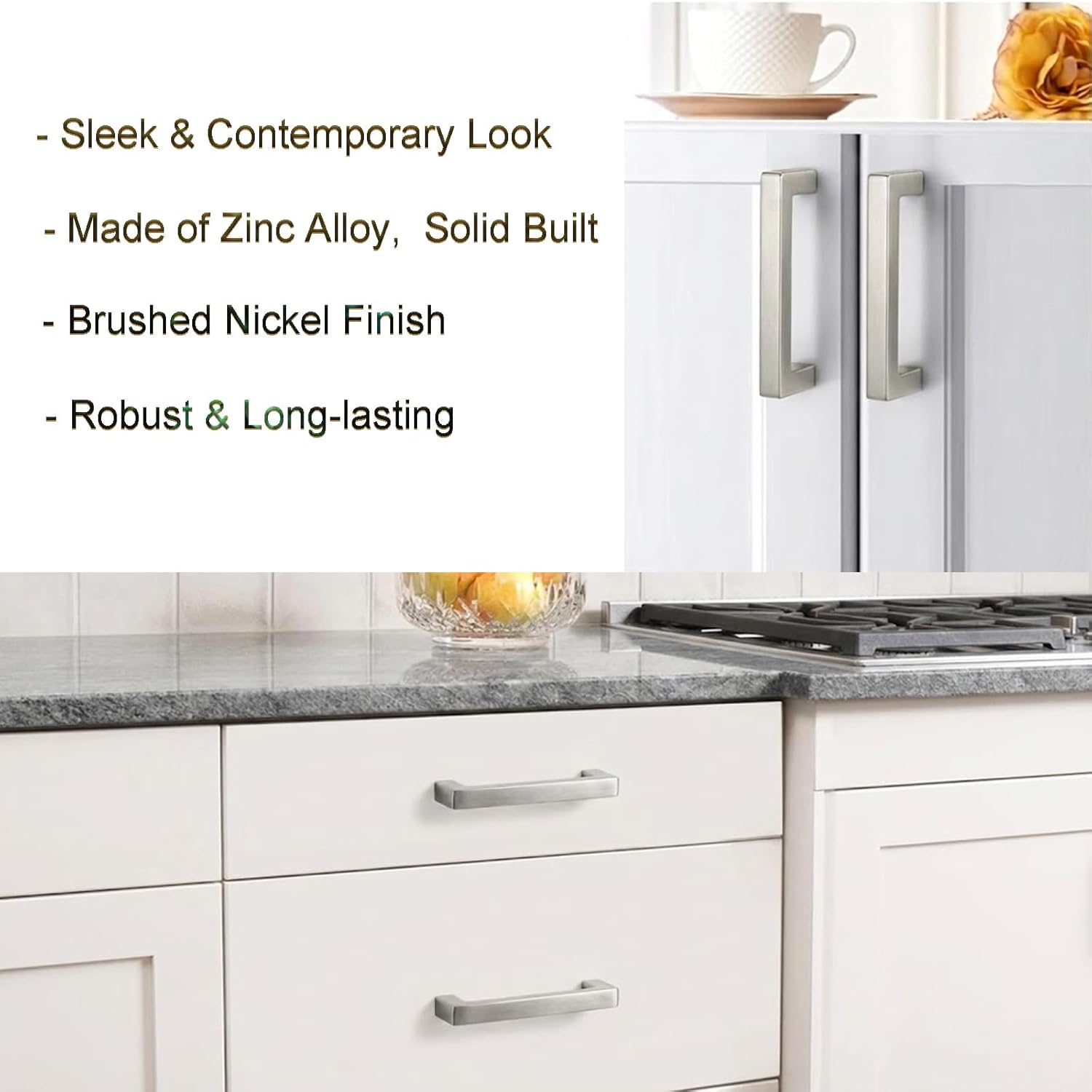 Characteristics: * Built for durability and resistance, these brushed nickel drawer pulls withstand corrosion, wear, fading, and rust, ensuring reliable performance through everyday wear and tear. * Featuring clean flat and sleek lines, this brushed nickel cabinet pull offers a minimalist yet elegant look. The solid construction provides a premium touch, instantly elevating the style of your kitchen cabinet doors and drawers. * These brushed nickel drawer pulls are ideal for contemporary/ traditional/ farmhouse-style kitchen cabinets, dressers, bathroom cupboard, vanities, wardrobe, nightstands and closet doors etc. Specifications: * Material: Solid Zinc Alloy * Color: Brushed Nickel * Hole Center: 3 inch (76mm) * Overall Length: 3.3 inch (84mm) * Overall Height: 0.95 inch (25mm) * Single Handle Weight: 1.9oz (53g) * 60 M4-Standard Screws per Handle inclusive: 30pcs 1-inch(25mm) and 30pcs 1.75-inch(45mm) cuttable * Suitable for 1/4"–1-3/8"(10-35mm) thickness board Packlist: 30x 3-inch Brushed Nickel Cabinet Handles 60x 25mm Screws 60x 45mm Cuttable Screws