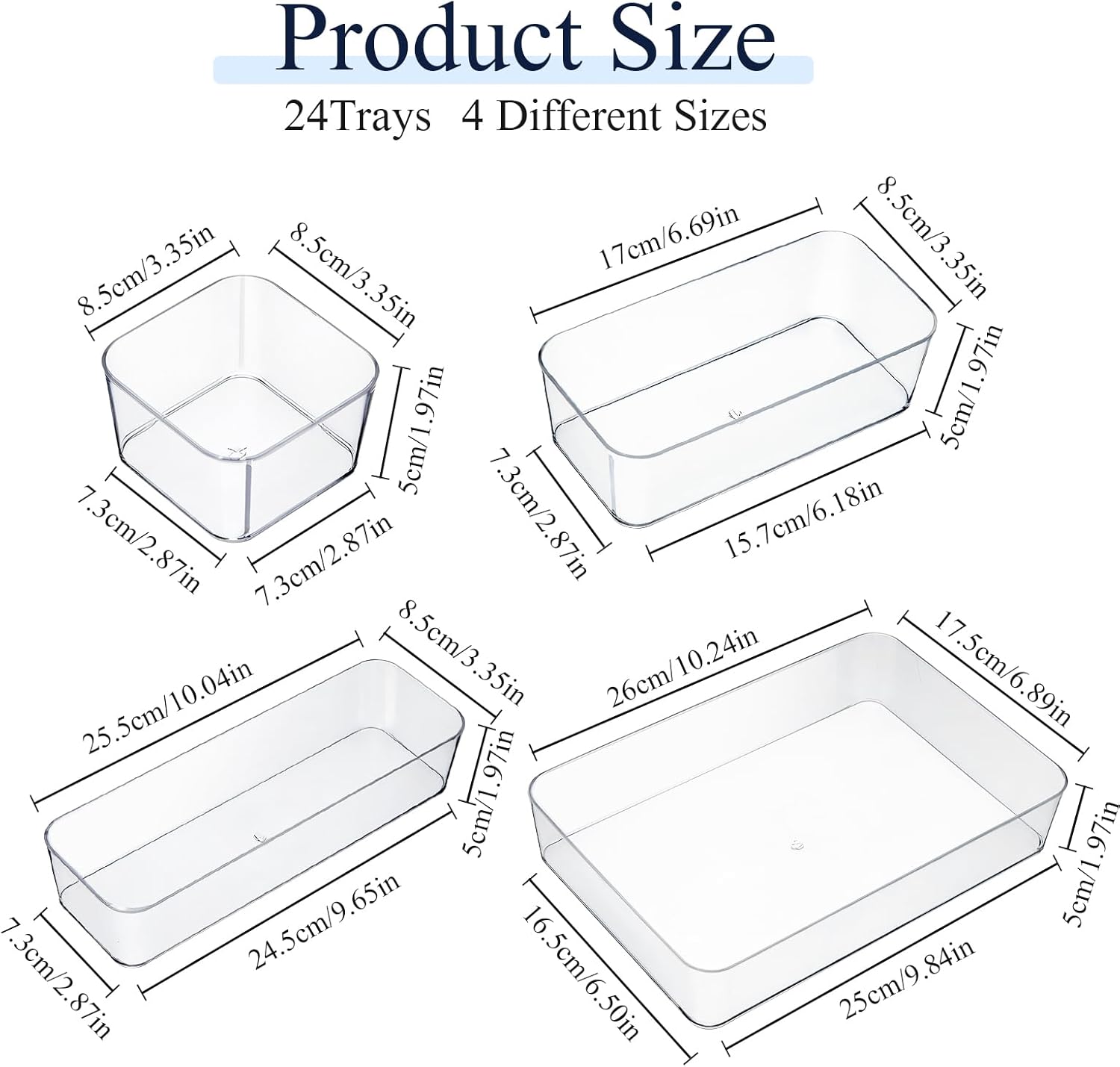 | Included Components | 24 Stackable clear plastic drawer organizers, 6 Clear cotton swab boxes with lids |