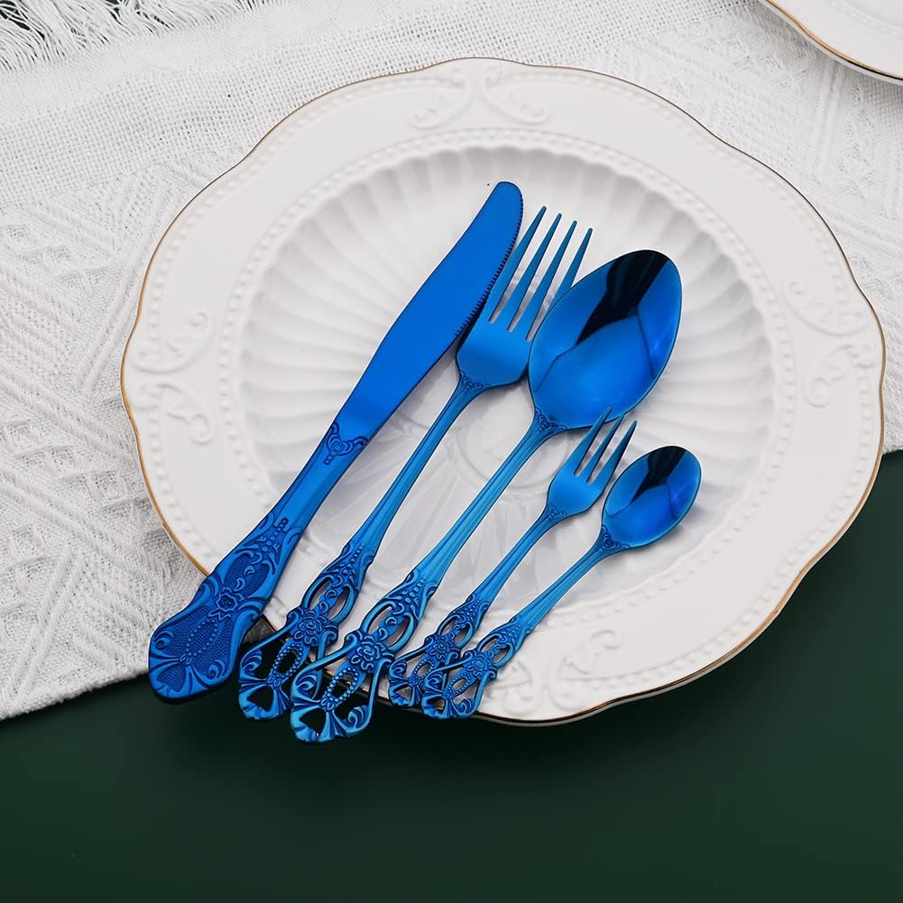 Package Quantity & Size: Dinner knife x 6 (9.0in, 3.2oz) Dinner fork x 6 (8.3in, 1.0oz) Table spoon x 6 (8.3in, 1.4oz) Salad fork x 6 (6.7in, 0.7oz) Dessert spoon x 6 (6.7in, 1.0oz) Features: --Stainless steel material is sturdy, easy to clean. --Shiny mirror-polished, elegant design flatware sets effortlessly uplift the visual appeal of your dinner table. --Suitable for daily use and ideal for everyday home use, hotel, restaurant, entertaining, party, buffet, bistro, camping, and picnic. --Best gift choice. As a great present on some important day, such as Birthday Christmas, Thanksgiving and so on. USING INSTRUCTIONS 1.Before first use the silverware set, please make sure no manufacturing residue and then wash it with warm soapy water. 2.Please clean and dry the silverware set after using it for your healthy daily use, Stored in a dry place for its durability. 3.The most important is that do not to clean the silverware set with wire brushes or any hard sponges for durability. Tips: Dishwasher safe. However, hand washing is more recommended, which can increase the service life of the flatware. Please feel free to contact us if you have any questions, we will do our best to offer help!!!