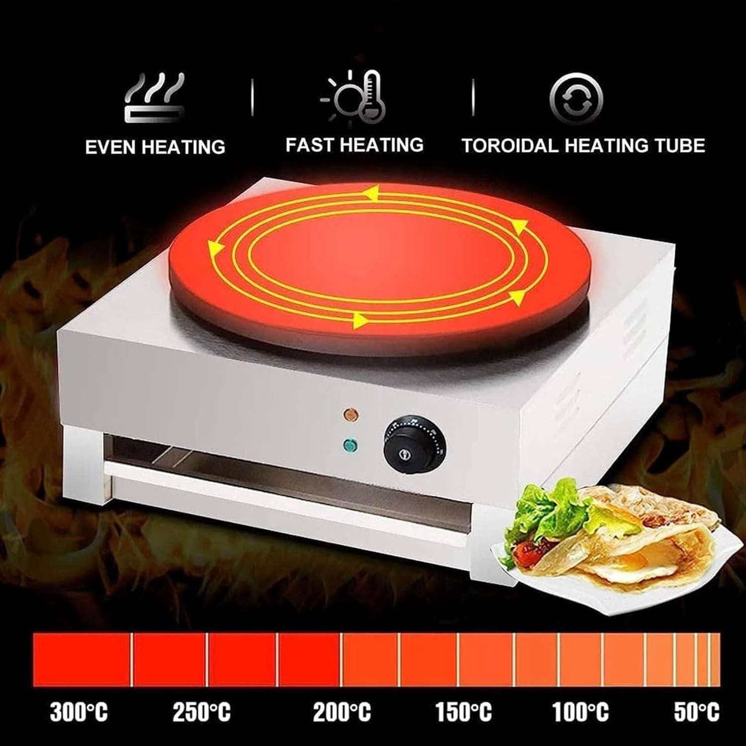 With this 3000W electric tortilla maker, you only have to worry about making the dough. The commercial tortilla maker will do the rest for you. Its perfectly round shape and non-stick coating make perfectly round tortillas. Try this tortilla maker for your next tortilla and it will become your new favorite appliance. Features 3000W high power Non-stick pan with even heating Constant temperature control (50-300℃) 40cm energy-gathering heating plate Stainless steel body Specifications Name: pancake maker Weight: 15kg Dimensions: 450x485x240mm Power: 3000W Diameter: 40cm Voltage: 110V/220V Scope of application: tea restaurant, bakery, pastry shop, western restaurant Package includes Commercial electric pancake maker x1 Accessories x1 Instruction manual x1 Notes 1. Manual measurement, please allow 1-3cm error, please make sure you don't mind before placing an order. 2. Due to the different placement of the pictures, there may be color differences, please understand.