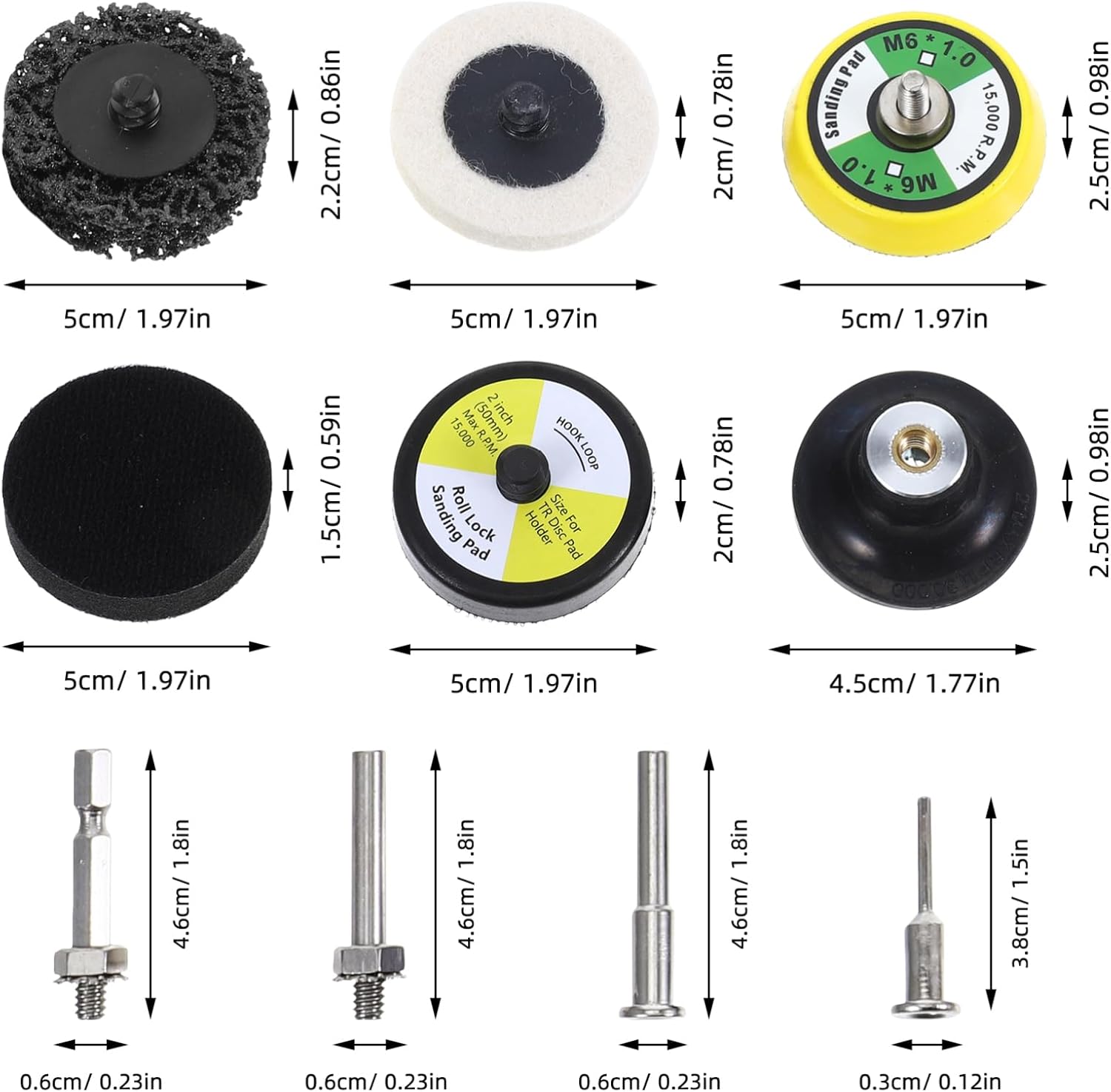 Package Include 300 x Sanding Disc 4 x Drill Attachments Features -Material:Plastic, nylon, alumina, zirconia torque sanding discs -Color:Assorted Color drill sanding attachment -Extensive grit selection: the 2 inch sandpaper ranges from 36 to 3000 grit, allowing for precise grinding and achieving a smoother finish on your projects twist sanding discs -Versatile usage: ideal for a variety of grinding , including metalworking, woodworking, and furniture , catering to diverse industry requirements sandpaper drill attachment -Longlasting durability: built to be wearresistant and , this set is designed for longterm use without frequent replacements, ensuring dependable performance orbital sander pads -Rapid grinding performance: the 50 mm drill and grinder included in this set enable quick and efficient grinding, enhancing your overall work efficiency sanding pads for orbital sander -Multiple shaft options: with 3 mm and 6 mm shaft support plates, this set accommodates different sandpaper sizes, providing greater flexibility in use sanding disc attachment -Size:5.00X5.00X2.50cm/1.97X1.97X0.98in sandpaper assortmentGoods Descriptionrotary sander pads The 2-inch sandpaper is ideal for detailed work and can be easily attached to drills and grinders.die grinder sanding disc The included 3mm and 6mm shaft backing plates provide stability and support, allowing you to work with precision.orbital sander pads Whether you're working on a DIY project or a professional job, this 300-piece sanding disc set has you covered.rotary sander kit From coarse to super fine grits, this set offers a comprehensive range for all your sanding needs