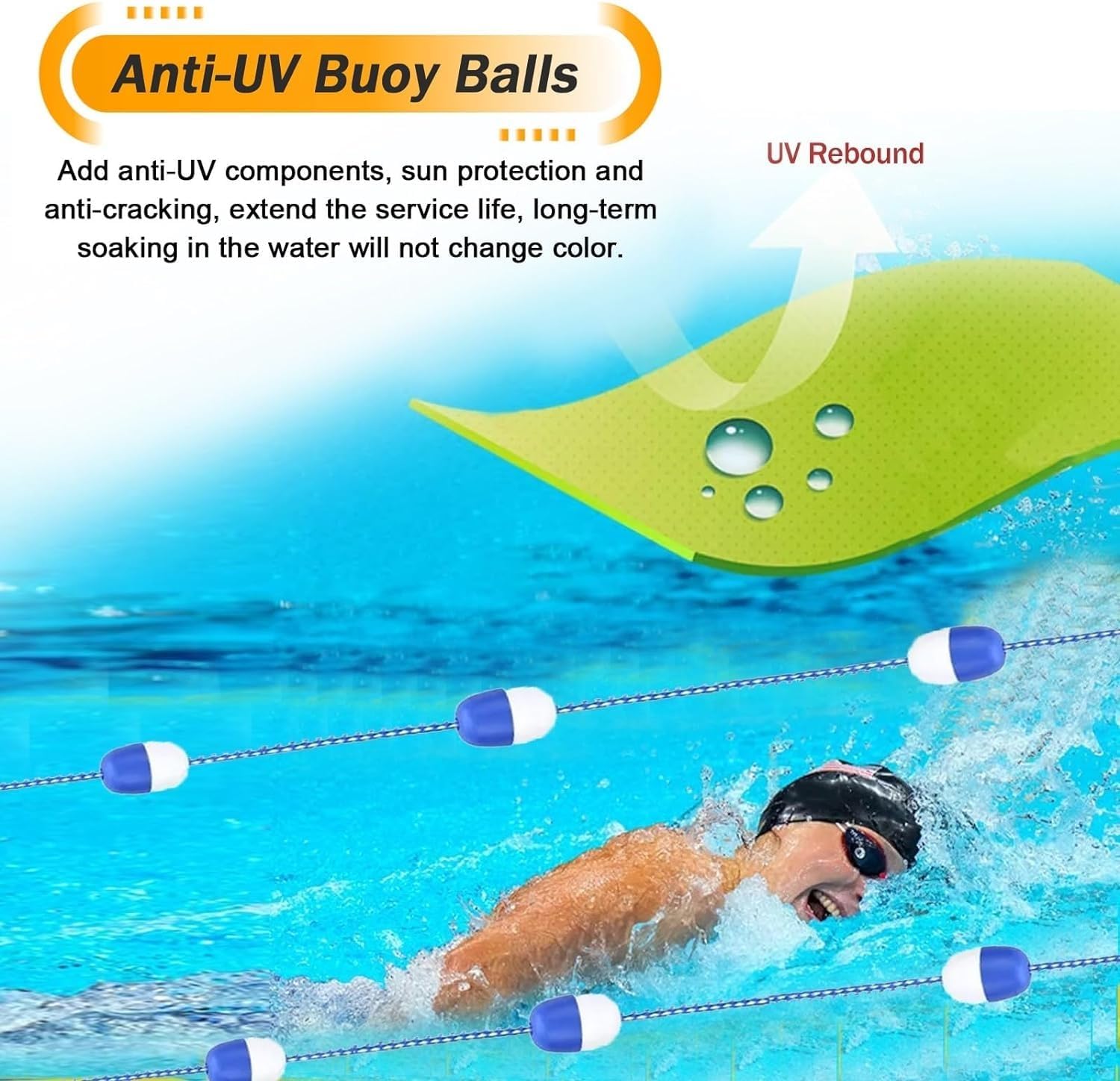 **Specifications:** - **Material:** Durable polyethylene with steel wire rope and stainless steel hooks - **Color:** Striking blue & white for easy visibility - **Number of Floats:** 3 floats per meter - **Single Float Size:** 7cm x 10cm (2.8in x 4in)**Key Features:** - **Increased Safety:** Constructed from robust PVC and nylon rope, this safety divider is wear-resistant and designed for long-lasting use, ensuring a safer swimming environment for your loved ones. - **Easy Identification:** The buoy design enhances visibility, making it perfect for clearly marking dangerous areas or swimming lanes, helping swimmers to navigate safely. - **Floating Buoys:** The eye-catching blue & white bi-tone floating buoys not only look great but also provide clear distinction in the water, allowing for easy identification of safe swimming zones. - **Wide Application:** This versatile product is suitable for various settings, including swimming pools, waterways, and shallow areas, making it a valuable addition to your aquatic safety tools.**Package Includes:** 1 x Pool Divider Rope**Note:** Please allow for slight variations in measurement (1-2 cm) due to manual measurement. A minor odor is normal and will dissipate within a few days. Color differences may occur due to lighting and display settings, so please refer to the actual product for true color representation.