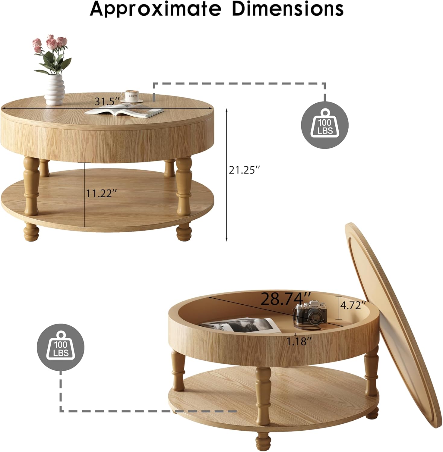 Vintage Farmhouse Round Coffee Table with Hidden Compartment & Storage ShelfEnhance your living space with this beautifully crafted two-tier round coffee table, blending vintage charm with modern farmhouse style. Perfect for cozy corners, living rooms, or reading nooks, this functional yet elegant piece offers both style and practicality.Key Features:✔ Classic Two-Tier Design – Features a 31.5-inch circular tabletop with a hidden compartment and lower open shelf for convenient storage of books, decor, or everyday essentials.✔ Timeless Farmhouse Aesthetic – Designed with beautifully carved table legs and a natural wood finish, adding rustic warmth to any interior.✔ Solid Wood & MDF Construction – Built with a sturdy combination of MDF and solid wood, topped with a smooth real wood veneer for durability and a premium look.✔ Sturdy & Reliable – Supported by four strong legs with a 250-lb weight capacity, ensuring stability for daily use.✔ Water-Resistant & Easy-Clean Surface – The tabletop is treated to resist spills and stains, making maintenance effortless—just wipe clean!✔ Thoughtful Dimensions – Measures 31.5" L x 31.5" W x 21.25" H, with 28.74"L x 28.74"W x 4.72"H internal storage space. The compact size fits perfectly beside sofas or in small spaces.Ideal for: Farmhouse, rustic, shabby chic, or modern decor styles. A versatile addition to living rooms, lounges, dorms, or bedrooms.Upgrade your home decor with this charming and functional coffee table !