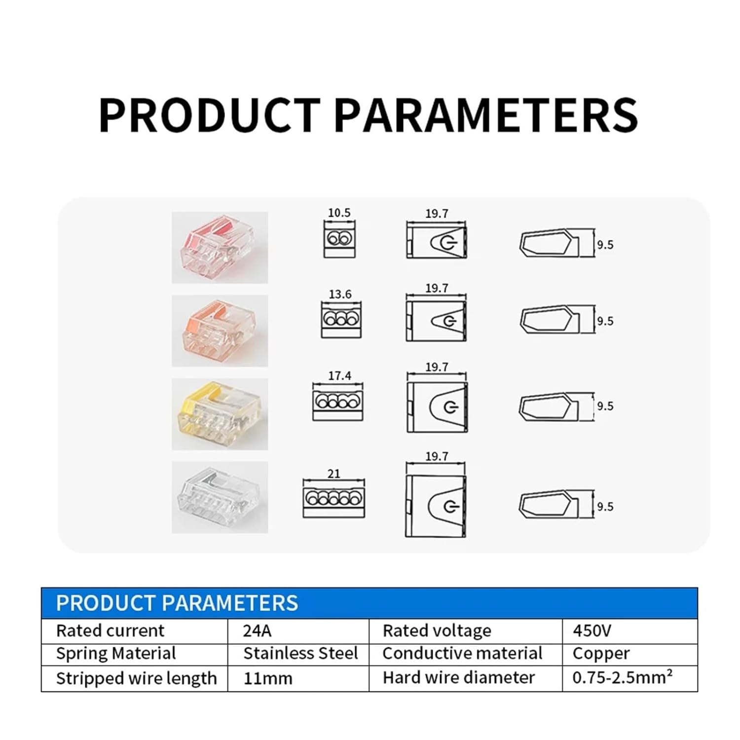 ConnectorsVoltage : 1V 2V 4V 5V 12V 12V Hign-concerned Chemical : NoneModel Number : CMK-25Voltage : 415VOrigin : Mainland ChinaCertification : CE,Voltage : 450VConnectors shell : Transparent polycarbonateContack springs : AISI 301 stainless steelWorking Temperature : -40°C to 85°CElectric connection : EquipotentialCurrent : 24AConductive parts : Thinned copperConnection capacity : 0.75-2.5mm²Strip length : 11mm/0.43 Inch