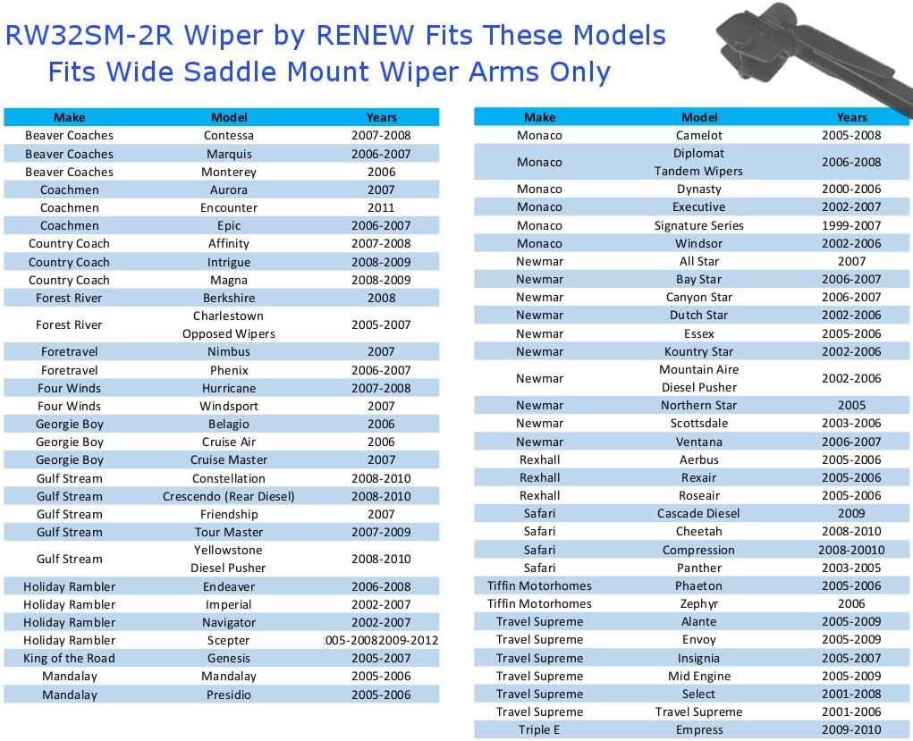 | Compatible with Vehicle Type | Class A motorhomes with Wide Saddle Mount wiper arms (not for J-hook) |