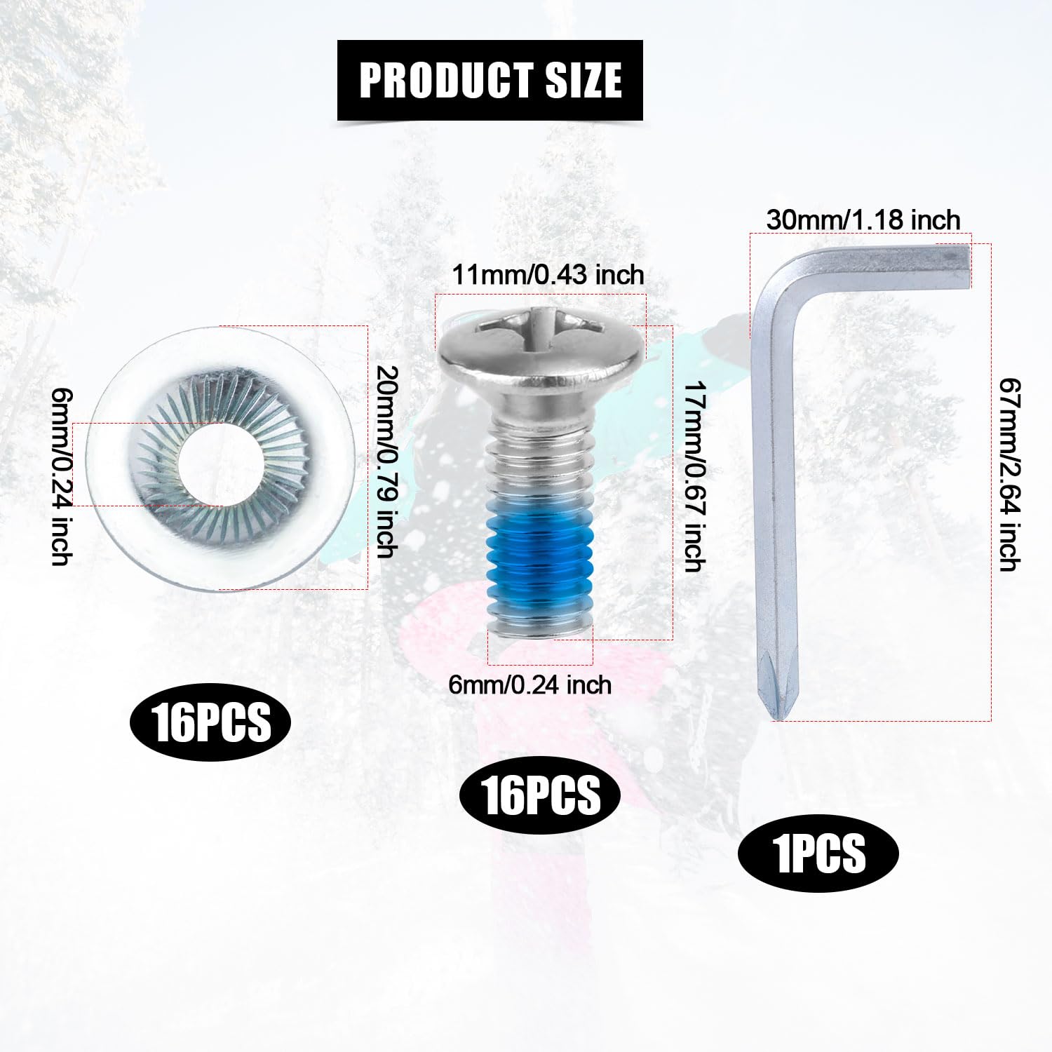 Specification: Color: silver Main Material: stainless steel Product Size: as shown in the picture Package details: a certain number of snowboard binding screws and screw washers 1 x screwdriver Note: Due to manual measurement, the size and weight may have a certain error. Due to the difference between monitors, there may be a slight color difference.