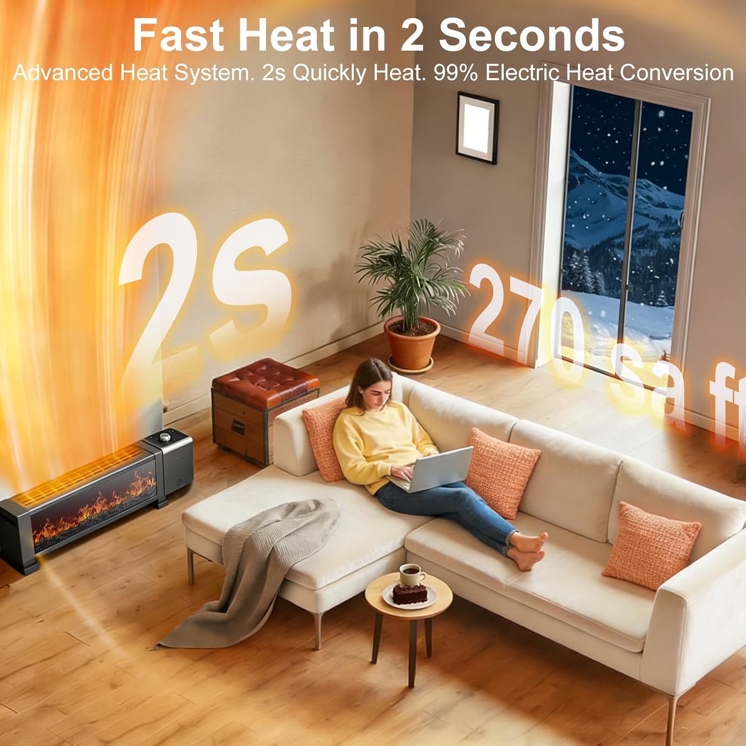 Baseboard Heater with Fireplace, Convection Electric Fireplace with Realistic 3D Flame Effect, Adjustable Thermostat, Overheat Protection, Space Heater for Large Room