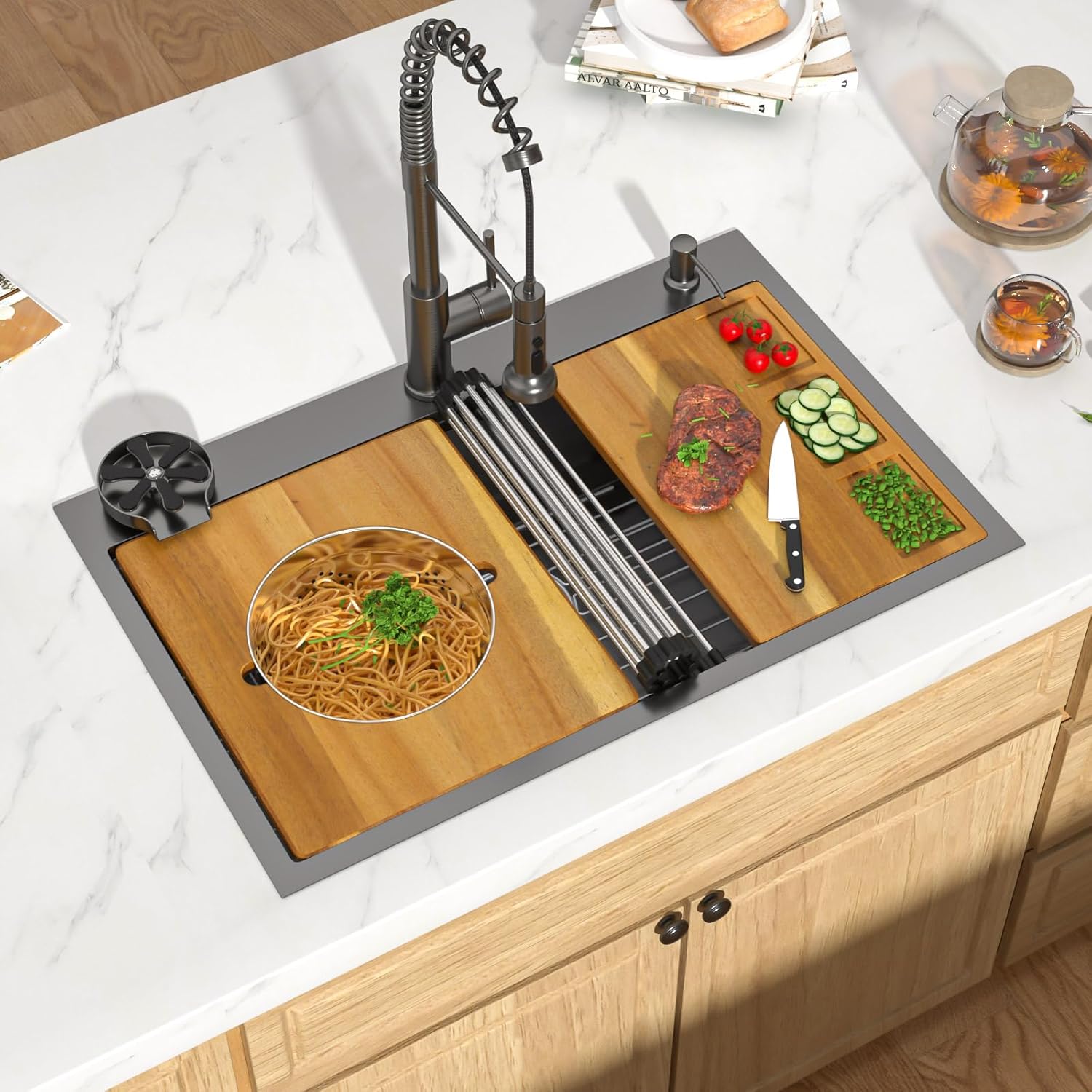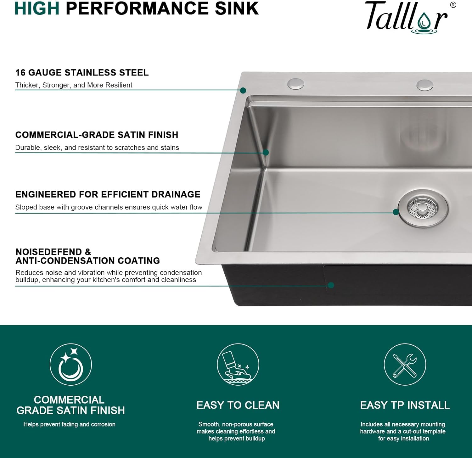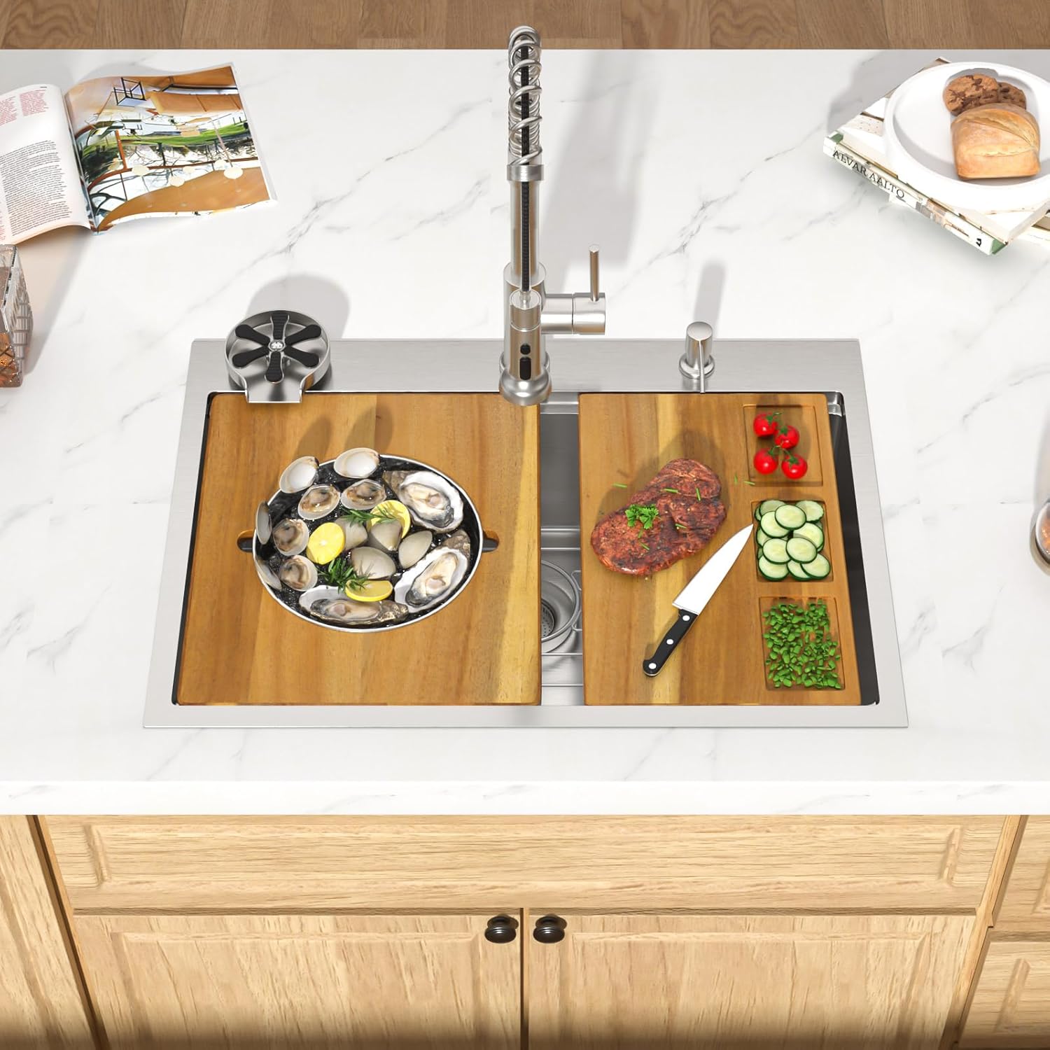 | Included Components | 33 Inch Stainless Steel Drop In Kitchen Sink, Mixing Bowl and Pasta Stainer, Cup Washer, Pop-up Drain, Installation Hardware, Stainless Steel Bottom Grids, Wood Cutting Board, Stainless Steel Roll-up Drying Rack, 1:1 Cutout Template |