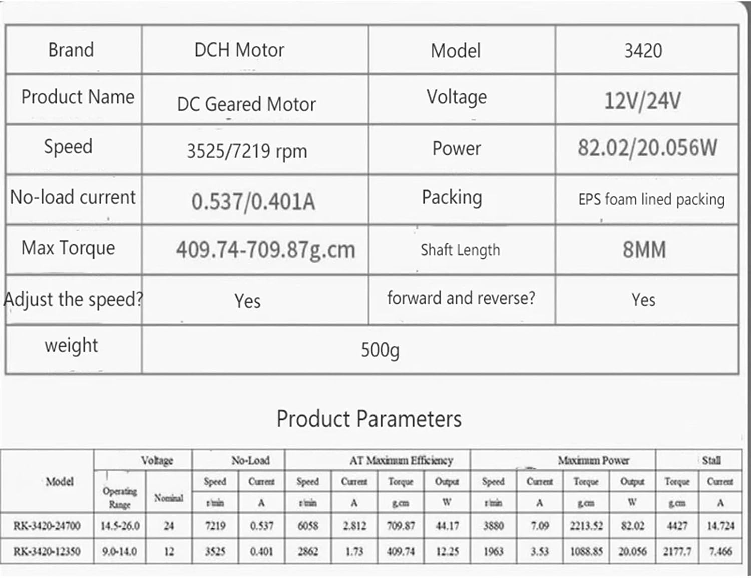 Electric MotorsSpecification:Rated volt:12V/24VNo load speed:3525/7219 rpmMax :409.74-709.87g.cmshaft length:8mmpower:82.02-20.056WOptions:short shaft style/long shaft style/Thread style12V 3525rpm,24V 7219rpmonly motorpackage 1:Motor+bracket+connecting rod+drill chuckpackage 2:Motor+bracket+connecting rod+drill chuck+grinding wheel+hardware toolspackage 3:Motor+bracket+connecting rod+drill chuck+shutter wheel+hardware tools