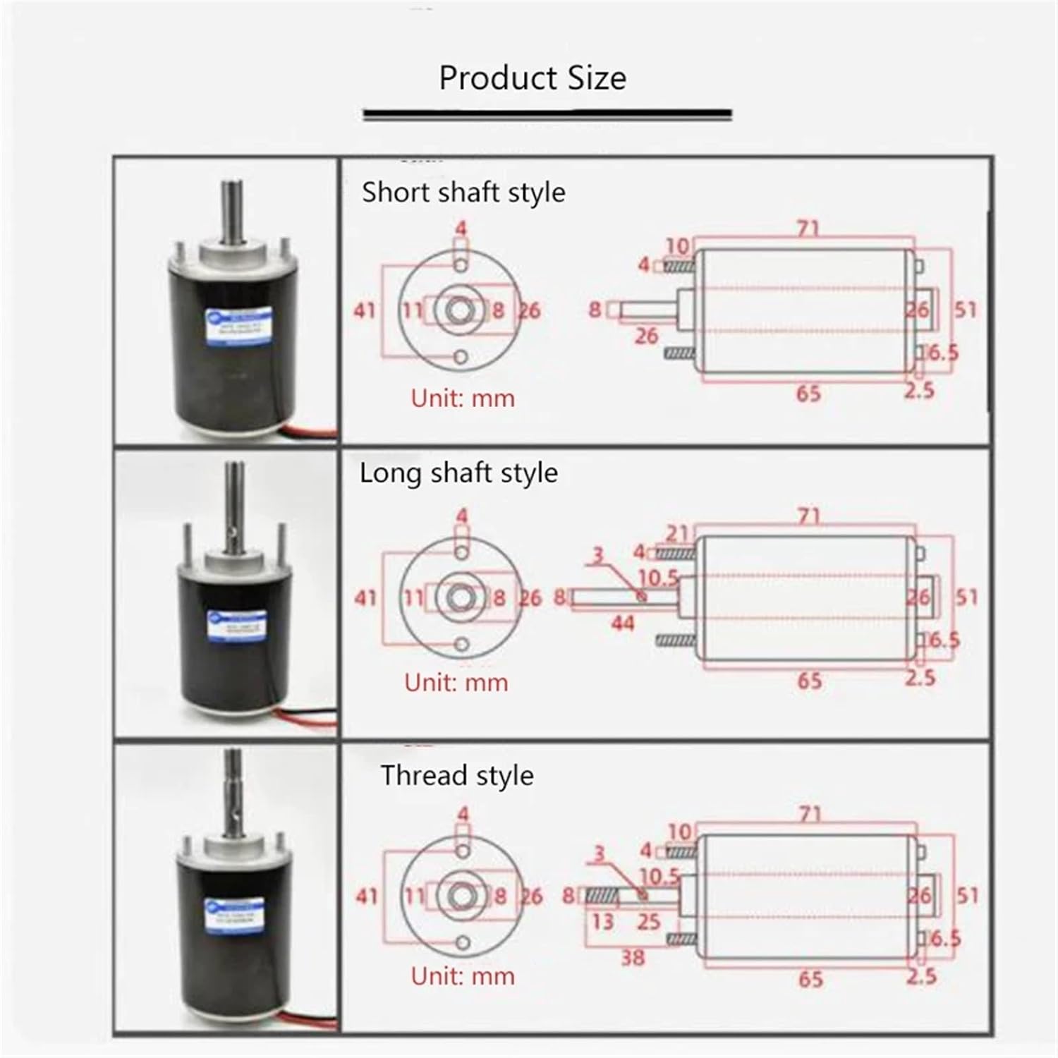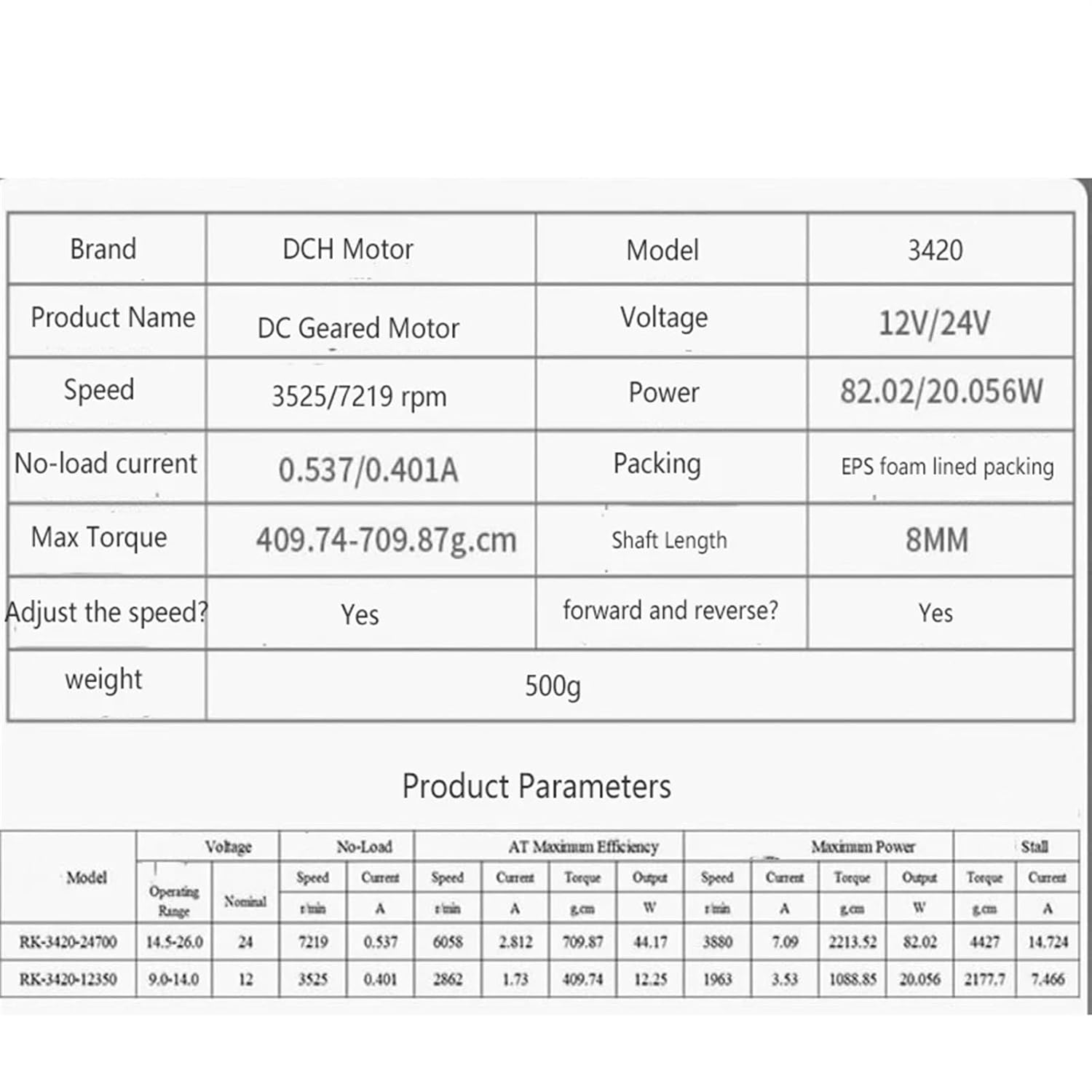 Power Transmission ProductsSpecification:Rated volt:12V/24VNo load speed:3525/7219 rpmMax :409.74-709.87g.cmshaft length:8mmpower:82.02-20.056WOptions:short shaft style/long shaft style/Thread style12V 3525rpm,24V 7219rpmonly motorpackage 1:Motor+bracket+connecting rod+drill chuckpackage 2:Motor+bracket+connecting rod+drill chuck+grinding wheel+hardware toolspackage 3:Motor+bracket+connecting rod+drill chuck+shutter wheel+hardware tools