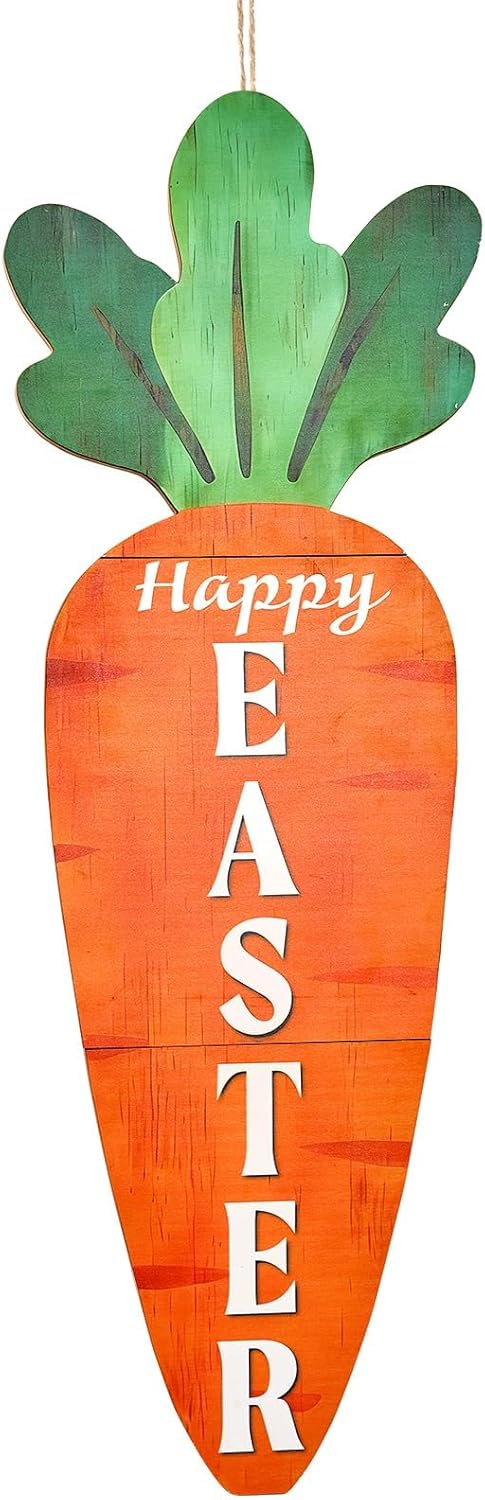 Features: Multi-Scene Decor: Designed as Easter carrot decor, this sign fits spring parties, egg hunts, holiday gatherings, classrooms, shops, and photo areas. The classic carrot theme integrates easily into both home and commercial Easter decorating environments Indoor Outdoor Accent: Created as a cheerful happy Easter porch sign, this wooden carrot decoration enhances indoor rooms and covered outdoor spaces. The visible holiday message adds a welcoming seasonal touch to doors, porches, and entry displays Specifications: Material: Wood Color: Orange, Green Style: Farmhouse, Rustic Occasion: Easter, Spring Holiday, Seasonal Decor Included Components: Wooden Carrot Sign, Jute Rope, 4 Bolts, 4 Nuts, Screwdriver, Wrench Shape: Carrot Special Feature: Hanging Ready, Vertical Display, Easy Assembly Product Dimensions:12.2 x 35.4 Inches (31 x 90 cm) Package includes: 1 x Wooden Easter Carrot Standing Porch Sign Notes: Manual measurement, please allow slight errors on size. The color may exist a slight difference due to different screen displays.
