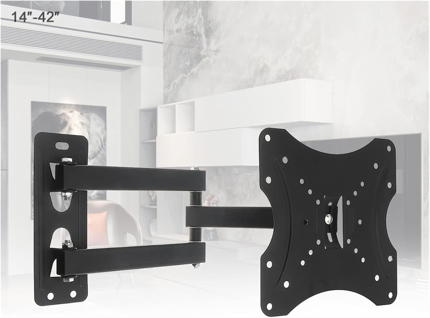 TV Mount StandsDescription Model: TA42Arm length: 300 mmApplicable Size: 14-42 inchesMaterial: Cold tie plateHole Length: 200mm(those within 200 can be used)Hole Width: 200mm(those within 200 can be used)VISE standard hole spacing conforming to 75X75mm, 100X100mm, 200X200mmMaximum distance from Wall: 430mmAdjust Angle:Up and down by 30 degrees,left and right can adjust 180 degrees..Maximum Load: 35kg/77lbs(Recommended load-bearing capacity of 25kg)Features:- The one-piece panel is simple and easy to operate.- Automatic telescopic adjustment design, stretchable and rotatable.- The key parts are thickened, the structure is stable, and the ability to withstand weight is strong.
