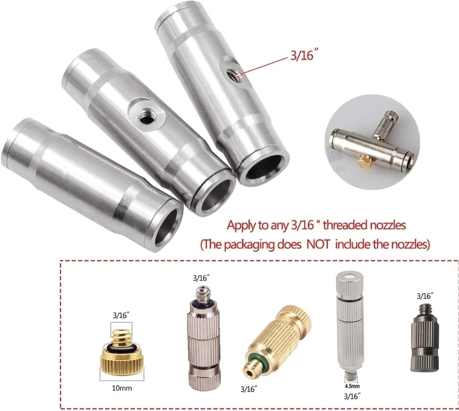 Name: Misting Nozzles TeesMaterial: Brass (Nickel finished)G3/16" Female Thread for Connecting nozzlesSuitable for 3/8Inch (9.52mm) pipe;Working Pressure: 20-120 Bar/ 290-1740PSIQuick installation: Apply to any 3/16"threaded nozzlesAdvantage: Leakproof,durable