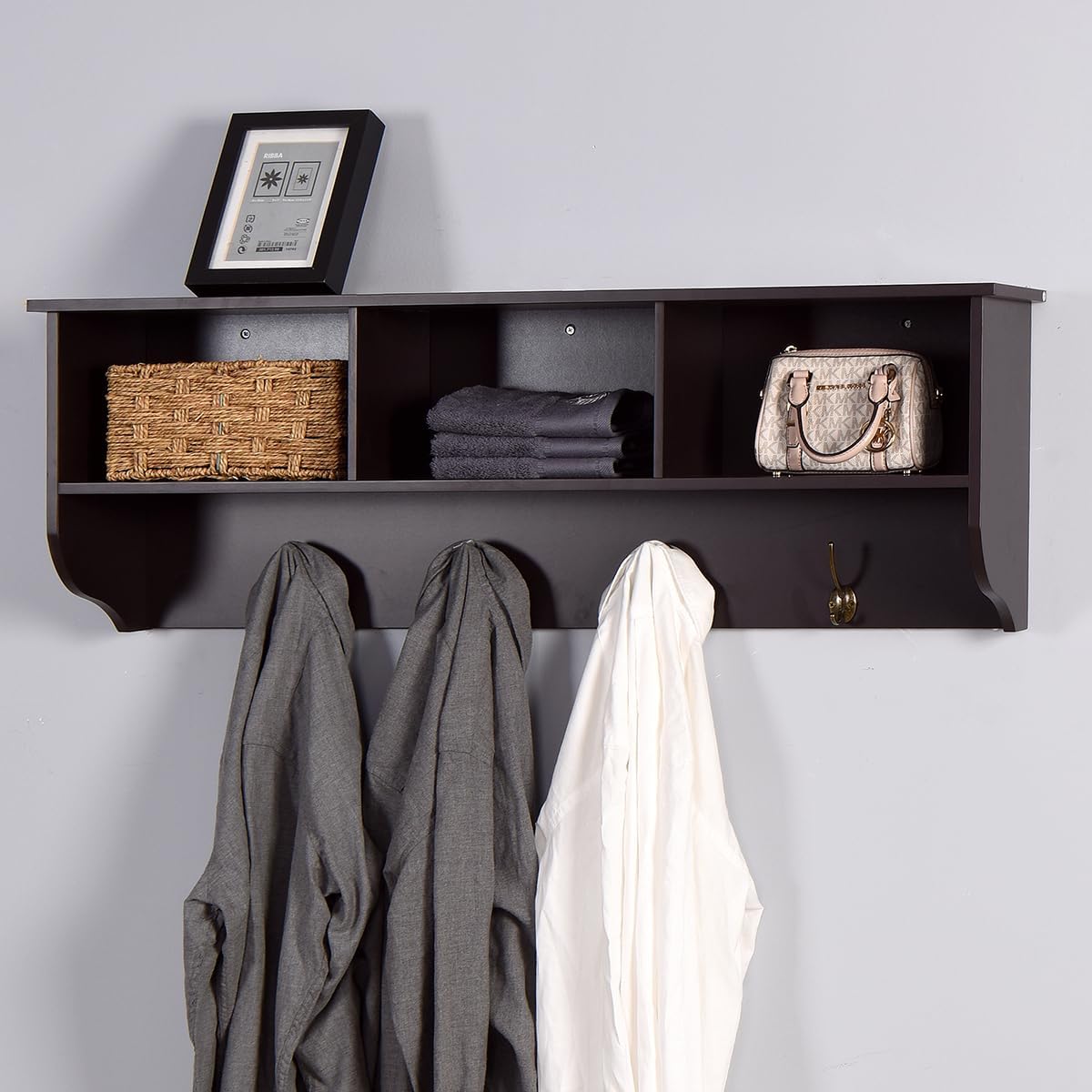 | Additional Features | 3 Storage Cubbies, 4 Dual Hooks, Space Saving Design, Wall Mounted |