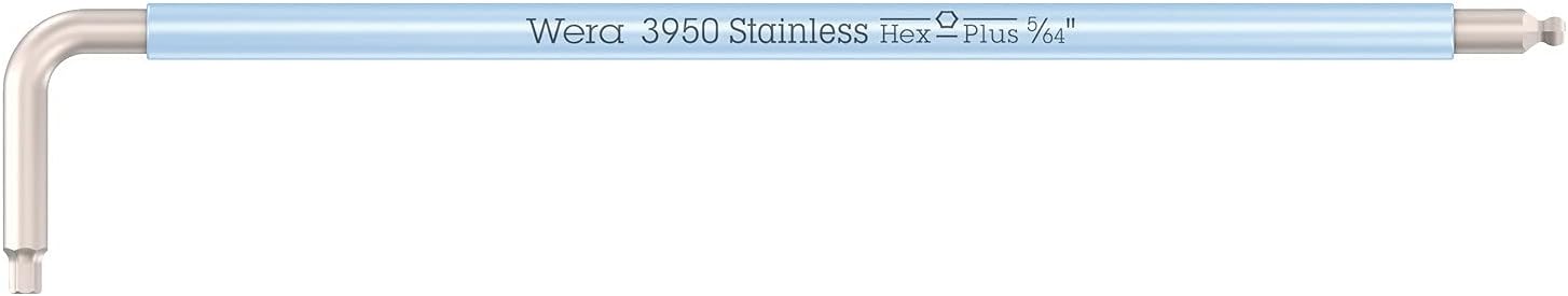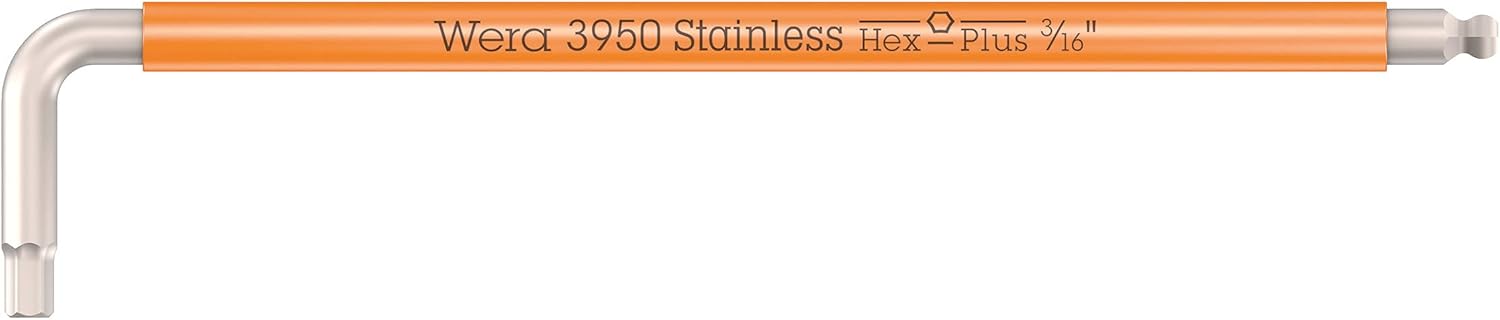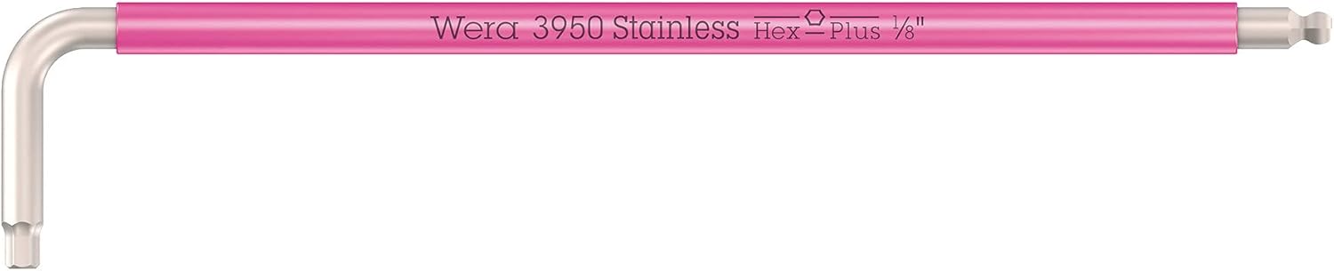 Premium L-key set made of stainless steel for imperial hexagonal socket screws by Wera. Stainless steel prevents transmission of extraneous rust. The Hex-Plus profile offers larger contact surfaces in the screw head. The notch effect is reduced to a minimum and the destruction of the screw head is almost eliminated. With hexagonal ball tip at the long arm: The ball-shaped tip profiles enable the tool shaft to be moved and pivoted relative to the screw axis which allows screwdriving "around the corner". Take it easy tool finder with colour coding by size. In an almost wear-free L-key clip. 1x 3950/9 Hex-Plus Multicolour Imperial Stainless 1, imperial, stainless steel, 9 pieces