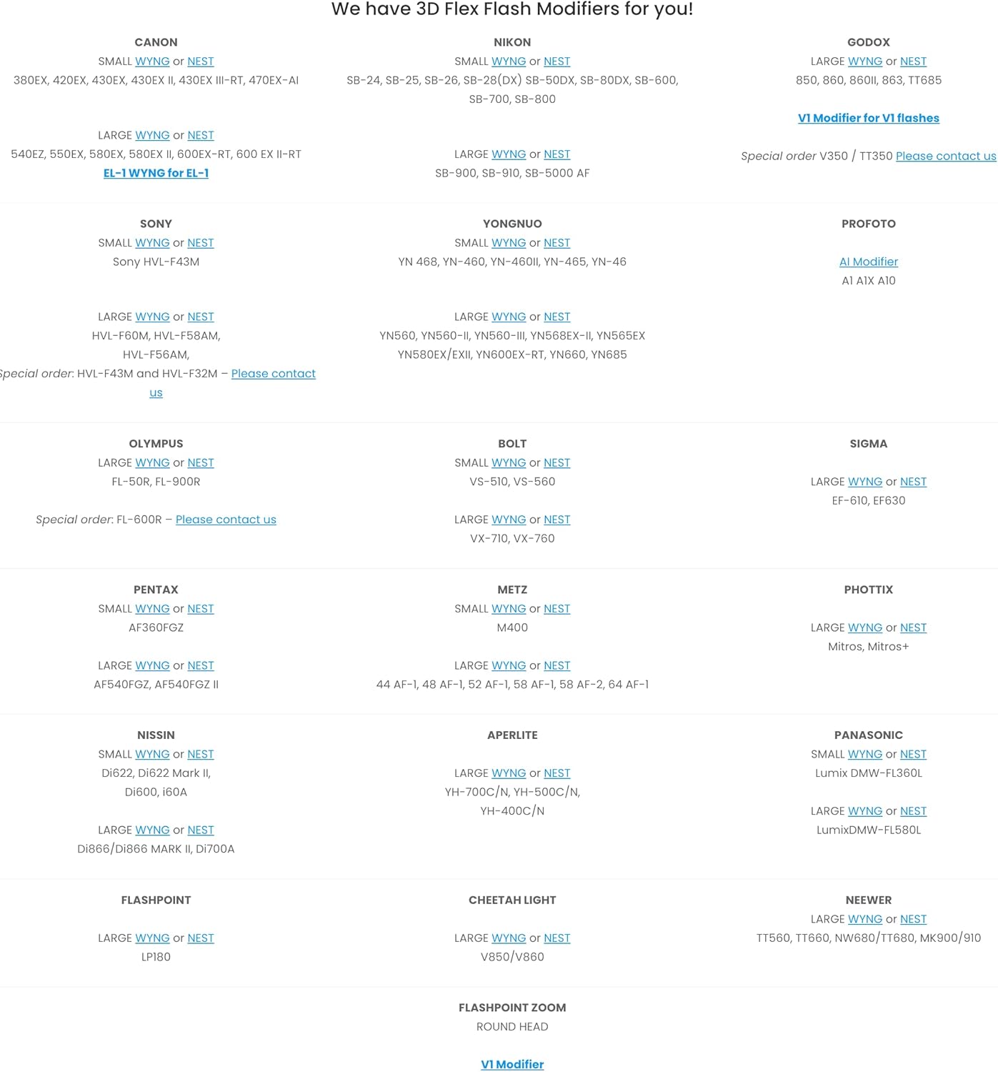 Eliminate harsh shadows and create a flattering light with The WYNG Bounce Reflector from 3D Flex Flash, available here for small flashes like the Nikon SB-600/700 or Canon 430EX. It simultaneously reflects light upwards for bounce and forward to illuminate your subject. Also, it has a curved design that efficiently reflects the light and when the flash is rotated 180° it offers a soft bulb style of diffused lighting. It is lightweight and flexible to fit in your bag or pocket, and uses a slip-on fitted attachment to secure itself to the flash head which is able to hold a gel securely in place. Compatible Flashes: IF YOU DO NOT SEE YOUR FLASH LISTED PLEASE CONTACT US TO GET THE RIGHT FIT. Canon 380EX, 420EX, 430EX, 430EX II, 430EX III-RT Nikon: SB-24, SB-25, SB-26, SB-28, SB-28DX, SB-50DX, SB-600, SB-700, SB-800 Bolt: VS-510, VS-560 Olympus: FL-600R YN468, YN460, YN460-II, YN465 Di622, Di622 Mark II, Di600, i60A