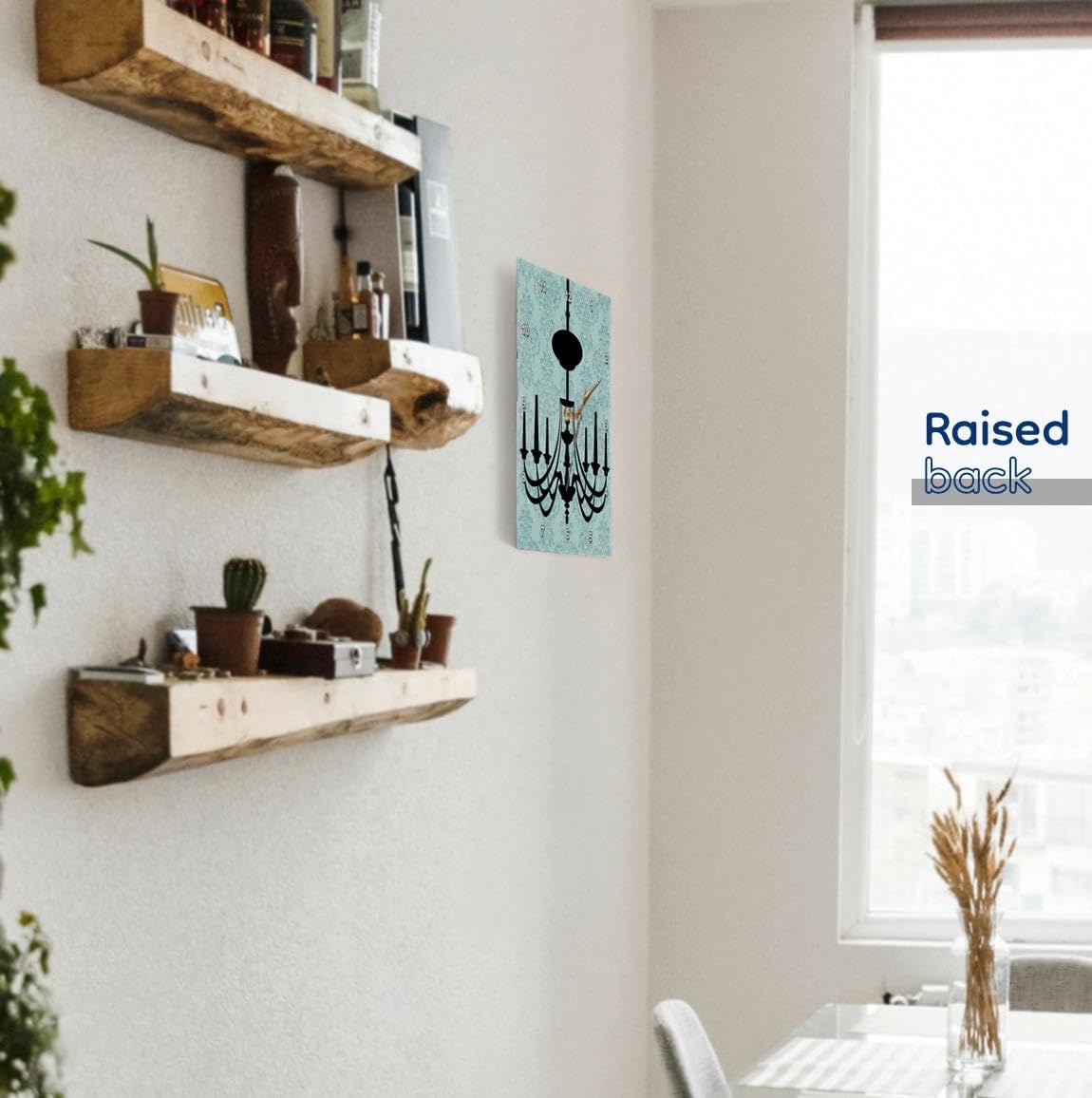 Black Chandelier against a light blue damask background wall clock is a wonderful complement to any room in your home or office. Made of durable high grade aluminum. This frameless clock has a high gloss mirror like, UV coated, scratch resistant finish and is suitable for a moist environment. Sizes available range from 10x 10to 15x 15. Requires one AA battery; not included. Battery box is not covered.