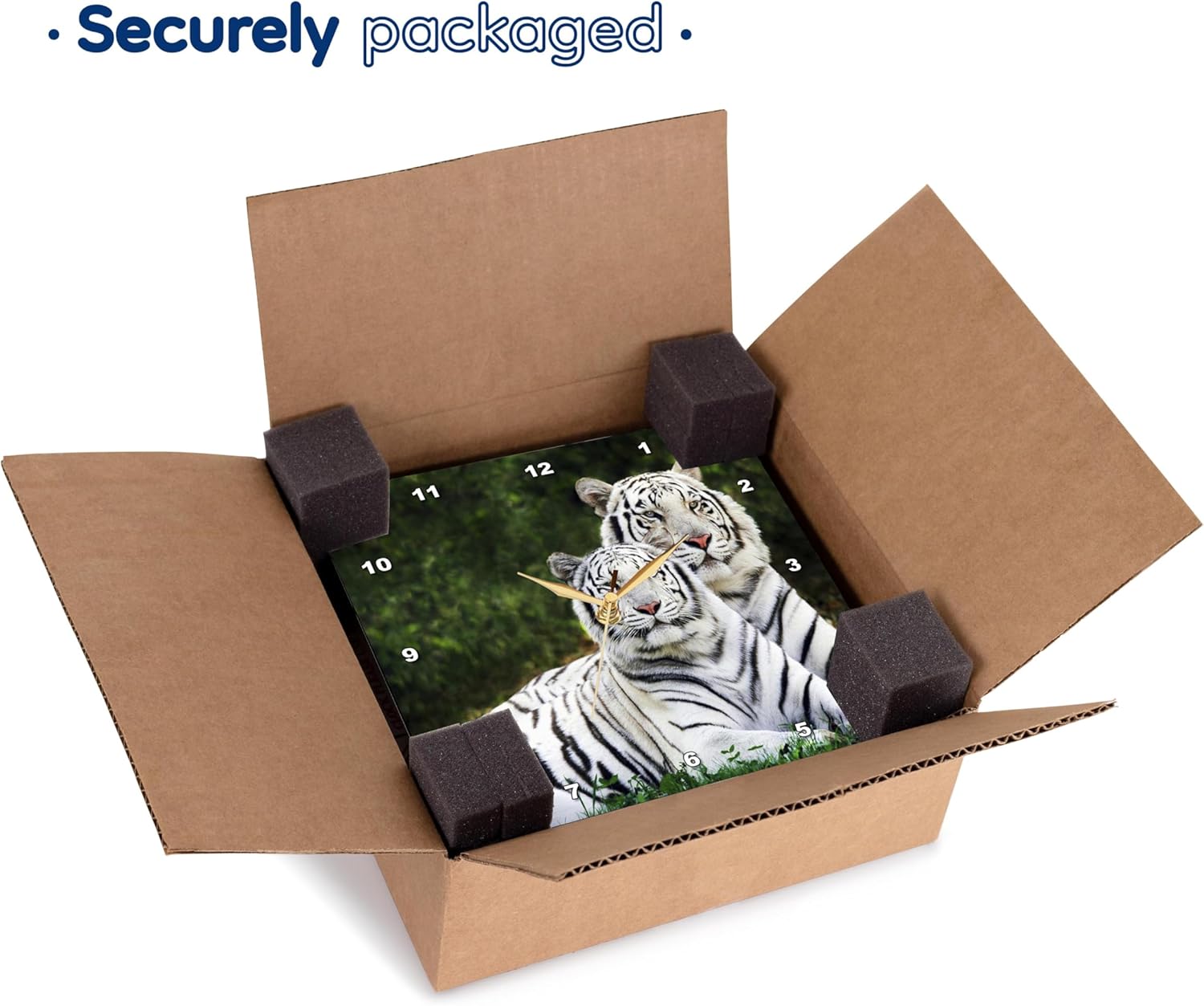 White Tigers wall clock is a wonderful complement to any room in your home or office. Made of durable high grade aluminum. This frameless clock has a high gloss mirror like, UV coated, scratch resistant finish and is suitable for a moist environment. Sizes available range from 10x 10to 15x 15. Requires one AA battery; not included. Battery box is not covered.