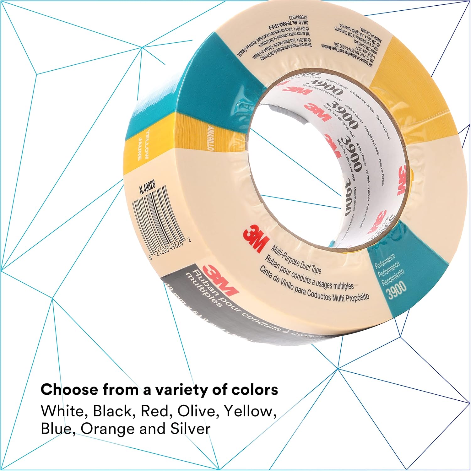 The 3M Multi-Purpose Duct Tape 3900 is made of polyethylene film laminated to cloth with a synthetic rubber adhesive. It resists curling and tears off the roll cleanly for simple applications in maintenance, repair and construction. This durable tape has a unique construction that is perfect for applications like color coding, process tagging, identification, highlighting hazards, sealing, bundling, holding and temporary repairs.
