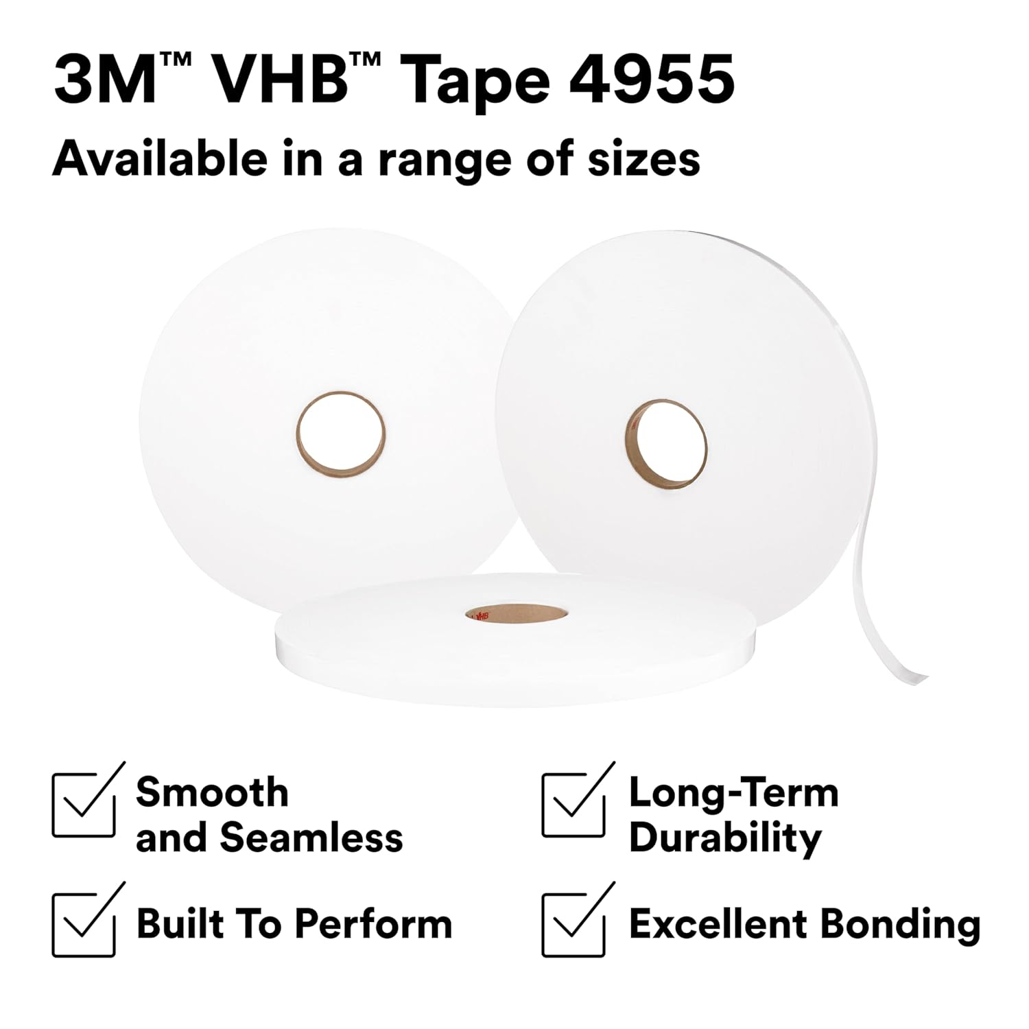 3M VHB Tape 4955 is a double-sided tape comprised of a general-purpose acrylic adhesive with a firm, foam core that delivers a total thickness of 80 mil (2.0 mm) when applied and requires no fixturing or curing time. Engineered to be strong, it can replace rivets, welds, and screws while providing faster production by eliminating the need for drilling, welding, grinding, and project cleanup. Offering seamless joining and minimal surface preparation, this easy-to-use bonding method keeps surfaces smooth and enhances the appearance of applications involving thin, lightweight, and dissimilar materials. Providing adhesion to a broad range of materials from metals, glass, and other high surface energy substrates, the advanced closed-cell acrylic technology provides secure bonding that protects against water and seals tightly for long-term durability. It performs in applications for short-term use (up to four hours) at a temperature up to 400 °F (204 °C) or long-term use withstanding up to 300 °F (149 °C). These attributes make 3M VHB Tape 4955 a reliable choice to take on a variety of bonding and sealing applications in transportation, signage, displays, general industrial, appliance, and electronics. Discover the many ways to apply the powerful bonding potential of 3M VHB Tape 4955. You can trust the science behind 3M VHB Tape 4955 and the other products in the 3M VHB 4950 Tape Family designed to excel in applications where long-lasting bonding, high shear strength, and viscoelastic properties are needed. Developed and introduced by 3M in 1980, the technology in this family is engineered to promote productivity, reliability, and durability, making it one of the most capable and versatile 3M VHB Tapes. The unique acrylic chemistry provides UV and chemical resistance that offers stable and dependable performance. With a variety of tape thicknesses to address diverse industrial requirements, you can be sure to find the right solution that brings exemplary results across many industries. Whether the product is used to perform stiffener to panel, signage applications, or a range of other uses, a 3M expert will consider all the aspects of your operation and determine which tape is best for you.