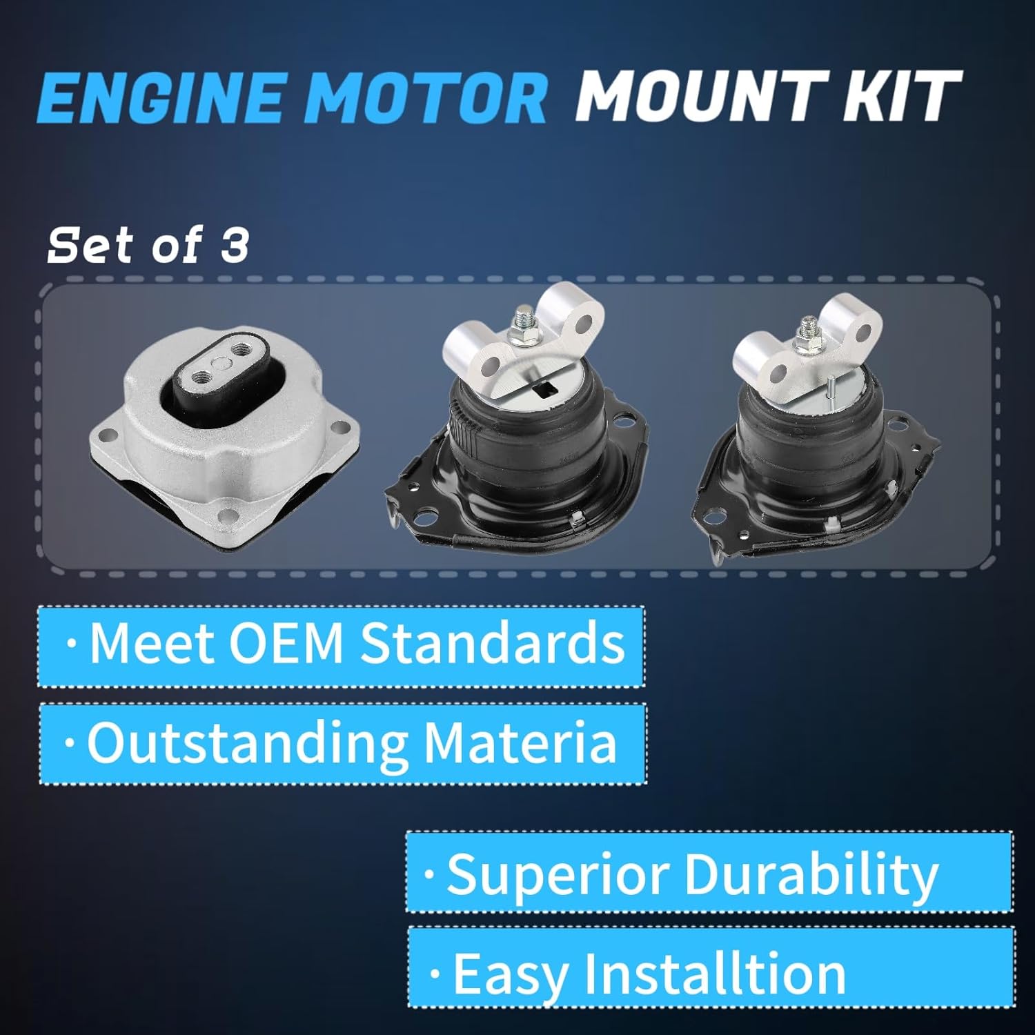 What is an engine mount?The engine mount is the component that connects the engine to the chassis, which suppresses engine vibration, limits engine displacement, prevents vibration and structural noise from being transmitted to the body, increases ride comfort, and reduces the impact of vibration on other adjacent components.Note: Please use Amazon's Your Garage feature above to see if this section is compatible with your vehicle! Verify that the engine motor and transmission support are suitable.Compatible With:2011-2022 Chrysler 300 3.6L V6 5.7L V8,2011-2022 Dodge Challenger 3.6L 5.7L V8,2011-2022 Dodge Charger 3.6L V6 5.7L V8Replacement for Part Numbers:A5522 A5388 3262 3162 4578061AC 4578061AD 4726030AG 4726030AH 5090140AG 52124671AD 52124671AEWhy Replace Engine Mounts?1) Shock and noise reduction: the engine mount has a good shock and noise reduction effect, which can effectively reduce and absorb the vibration and noise generated by the engine operation, so that your car can run smoothly as new.2) Easy installation, direct replacement: standardized design, engine mount can directly replace the original OE parts, the working principle is the same as the original engine. Installation does not require complex adjustment positioning, do not use air guns or any power tools, only use manual torque tools to tighten nuts and bolts to avoid damaging parts.3) High strength and durability: Our engine mounts are made of high-quality iron, aluminum and rubber, which have good durability and can withstand long-term use and various complex working conditions, reducing the frequency of maintenance and replacement.