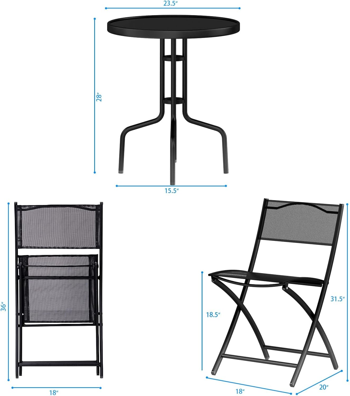 Specifications: Material: Metal Color: Black Table Size: φ24"(D) x 28"(H) Chair unfolded size: 18"(L) x20"(W) x 31.5"(H) Chair folded size: 18"(L) x6.5"(W) x 36"(H) Seat Size: 16"(W) x 15"(D) Back Size: 18"(W) x 15"(D) Table Weight Capacity: 135 Lbs Chairs Weight Capacity: 265 Lbs Net Weight: 26 Lbs Package Includes: 1 × Round Table 2 × Folding Chairs