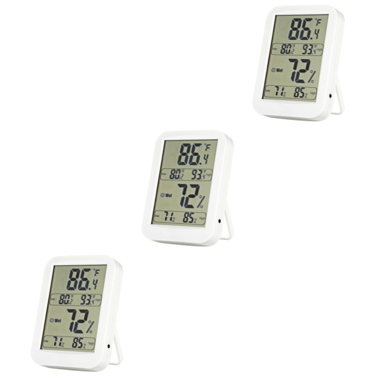 Package Include 3 x Large LCD Digital Hygrometer Indoor Thermometer Humidity Monitor Temperature Humidity Gauge Features - Accurate precision: plus or minus 1 degree Celsius, plus or minus 5 percent RH temperature monitor. - Humidity survey range: 10 percent to 99 percent humidity gauge. - Temperature resolution: 01 degree Celsius (02 degree Fahrenheit) humidity monitor. - Size: Approx 119 x 88 x 26cm/ 47 x 35 x 1 inch (LxWxH) digital hygrometer thermometer. - Color: White. - Temperature survey range: -10 to 70 degree Celsius (14 to 122 degree Fahrenheit). - Humidity resolution: 1 percent RH. - Accuracy: 0.1 degree Celsius, 1 percent RH. - Material: ABS. - Powered by 1pc AAA battery (not included) humidity and temperature monitor. - Can stand on the tabletop or be hung on the wall for convenient reading digital hygrometer. - Can be used to check the maximum or minimum indoor temperature and humidity at the same time. - Digital hygrometer displays high and low temperature and humidity records. - Large LCD display with temperature and humidity monitor; thermometer displays in fahrenheit or celsius.Goods Informationtemperature monitor With high design and easy to use, it is really a wonderful LCD digital thermometer and hygrometer for choice.humidity and temperature monitor You can easily mount and it on the wall or put it on the table with the help of the stand, for convenient viewing and reading.humidity monitor This item is a 2-in-1 LCD display digital thermometer and hygrometer, which is powered by one AAA battery, and can be used to check the maximum or minimum indoor temperature and humidity