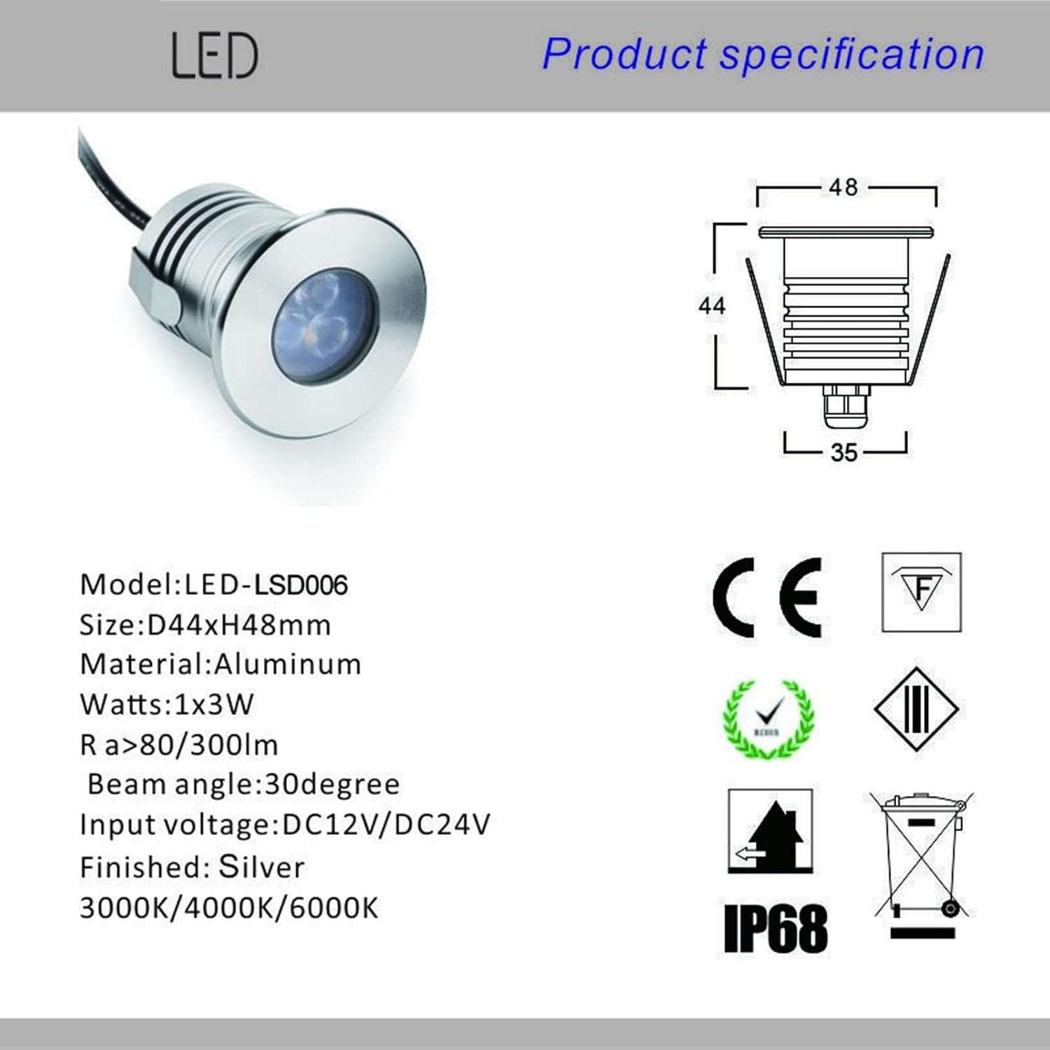 【Features: *The lamp body is small and flexible in application *The surface can withstand up to 300 kg of pressure *IP68 protection level, can be used underwater at 10 meters *The lamp body is made of stainless steel, which is anti-corrosion, high temperature resistant and never discolors. *Waterproof spotlight, improved optical adapter chip, high brightness, high color rendering, uniform light output and long life. 【Range: - Product Type: 3W Mini LED Ceiling Light/LED Downlight/LED Spotlight/Stainless Steel Pool Fountain Light - Power: 3W - Input Voltage: DC12-24V Lumen: 290 LM/W - Beam Angle: 30° - Protection Level: IP68 - Main Material: Stainless Steel - Body Size: P48mm x 44mm x34mm - These LED pool lights are perfect for illuminating various underwater environments such as swimming pools, fountains, ponds, aquariums, water tanks, boats, as well as steps, stairs, bridges and passages, and can also be used in shopping malls, squares and hotels, etc. Decorative lighting for commercial spaces. 【Set includes: 1/4/8PCS LED pool boat lights 【Service: 1. This product has passed CIE, IEC, EMC (3C) international execution standards, you can use it with confidence 2. The product is waterproof and rainproof 3. We are a factory with 9 years of experience in the LED field. If you have any questions, please email us and our professional engineers will answer your questions within 10 hours.
