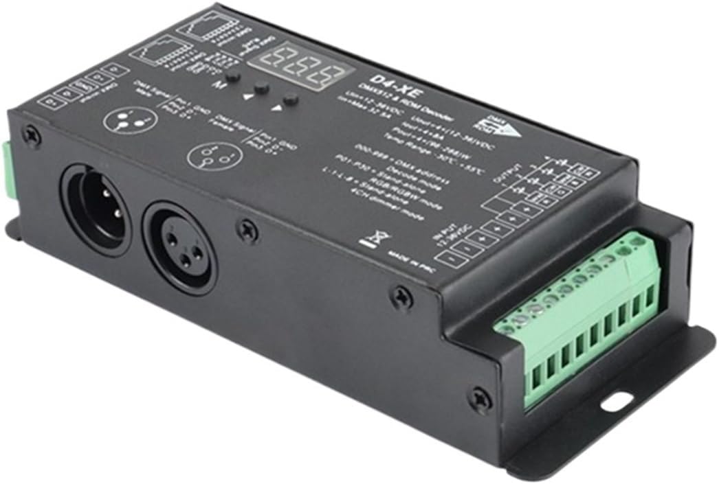 ControllersDimmersFeatures: Complies with DX5 12 standard protocolDigital digital display set the DMX decoding start address through buttons.For example the RDM function can realize intercommunication between DMX host and decoder.The DVX decoder address can be set through the DX console.1/2/4 DMX channel output.16bit (65536 levels)/8bit (256 levels) gray level PWM frequency 250/500/1000/2000/4000/8000/16000Hz optional.Logarithmic or linear dimming curve optional.Independent RGB/RGBW mode and 4-channel dimming mode are optional.Through button control of the built-in program it replaces the DMX signal green terminal XIR3 and RJ45 port DVX signal input.Overheating (short circuit protection) automatic recovery.Colour: BlackMaterial: metal + plasticPackage Contents:1 x D4-XE DMX decoder controllerContains only the above package contents and does not include other products.NOTE: Light reflections and different monitors may cause the color of the item in the picture to differ slightly from the actual item. The measurement allowance is +/-1-3cm.