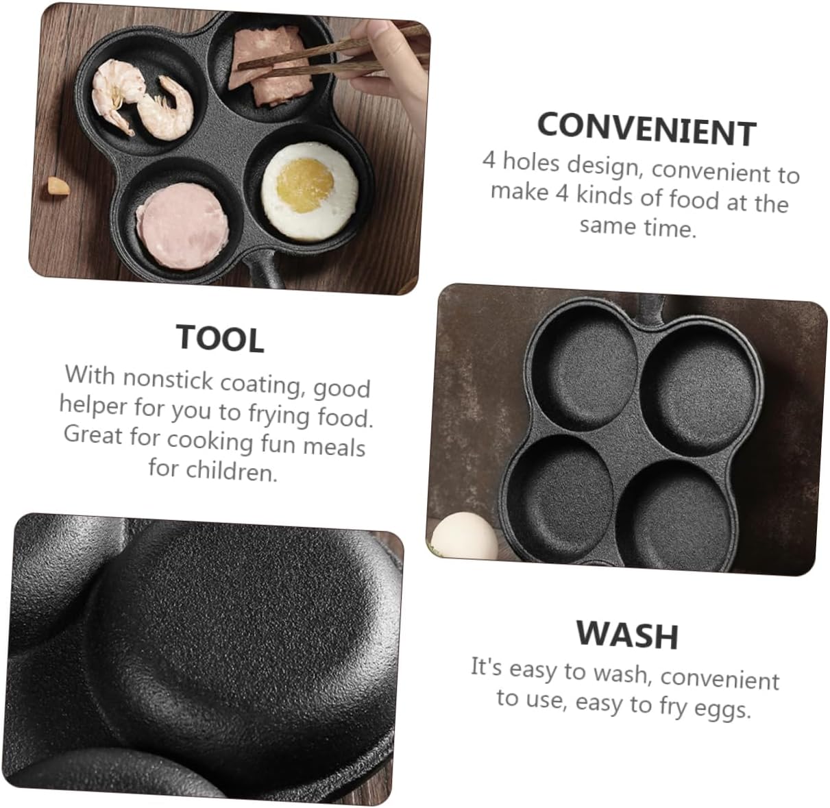 Package List 1 x Frying Pan Features -Material: Iron & Wood omelette pans -Color: Black egg frying pan -Size: Approx. 36 x 18.8 x 2.3 cm / 14.15 x 7.39 x 0.90 inch skillet frying pan - This four hole nonstick frying pan four kinds of delicious dishes, fried steak, pancake, Bacon and so on. omelet making pan - With nonstick coating, good helper for you to frying food. Great for cooking fun meals for omelette pan nonstick. - 4 holes design, convenient to make 4 kinds of food at the same time egg omelette pan. - It's easy to wash, convenient to use, easy to fry eggs frying pans. - Made of quality iron and wood material for use egg fry pan.Goods Informationomelet making pan It is perfect for making fried eggs, sandwiches, pancakes and omelets, etc.egg omelette pan This item is made of , which enables even and efficient heat distribution.small egg frying pan The frying pan is of every kitchen