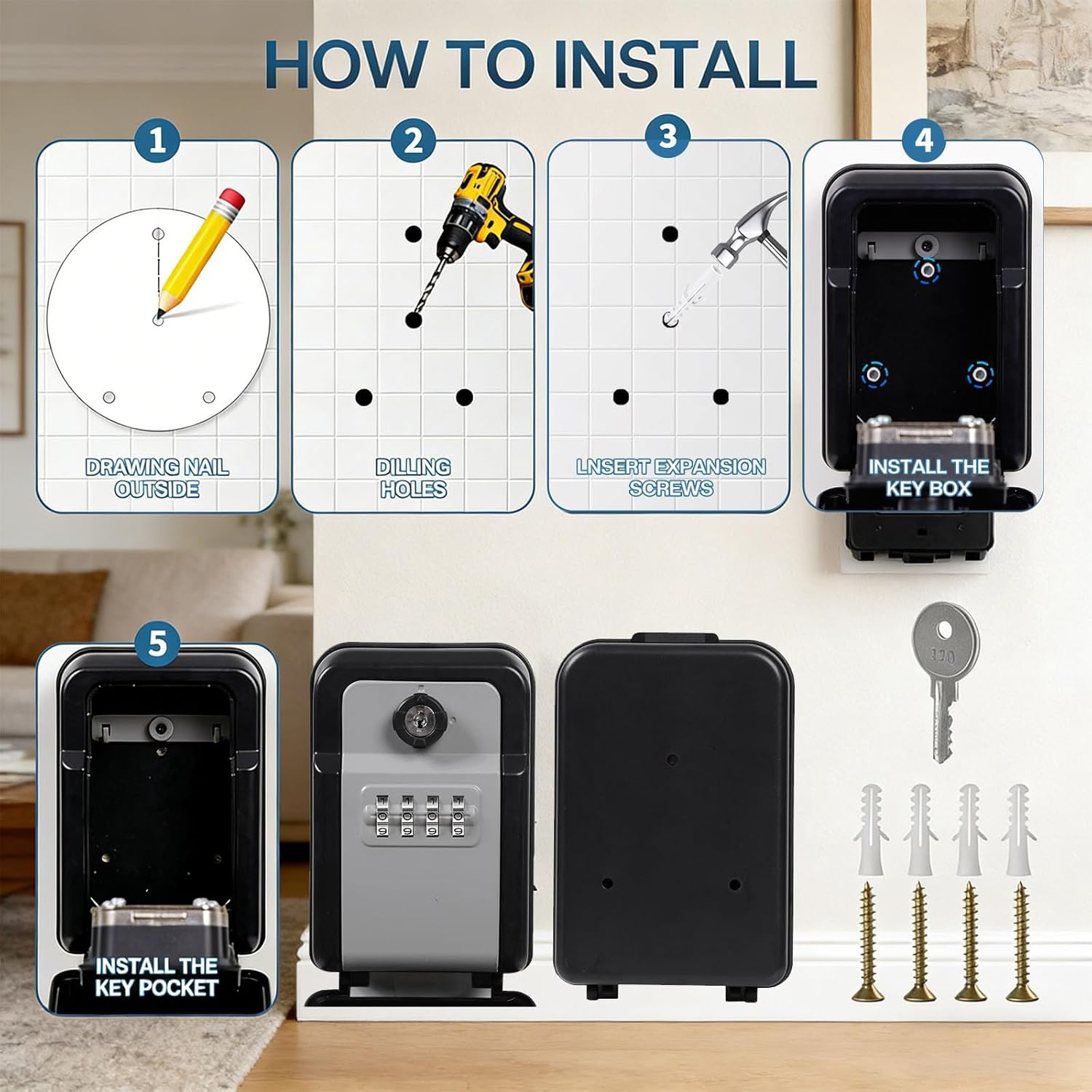 4 Digit Combination Safe Box for Indoor Outdoor Wall Mount Weatherproof Secure Storage Includes Backup Features This secure features a backup for access when you forget the combination, ensuring dependable storage for keys and small valuables with its 4 digit code security.Constructed from aluminum alloy and silicone cover, this wall mount safe a spacious interior, weather design, and easy combination access for both indoor and outdoor durability.Ideal for homeowners, property managers, and staff, this combination provides a safe for storing spare keys, important documents, or personals items securely.Perfect for mounting on wall near entryways, garages, or outdoor patios, this storage box allows retrieval without keys, enhancing accessibility in daily routines.With its robust build and ample capacity, this weatherproof safe protects belongings from and unauthorized access, making it a versatile addition to any secure setup.Specifications:Product name: combination Materials metalSize: 135x96x60mmFunction: Equipped with a spare When the password is forgotten, the can be used to open the and retrieve the password.4. Secure storageThe 4-digit combination design ensures safe storage of keys, documents or valuables.5. Weatherproof propertiesSuitable for indoor and outdoor use, with excellent weather resistance.Package Includes:Set of combination a pair of keysNote:Before using the accessory, please check if it is compatible.