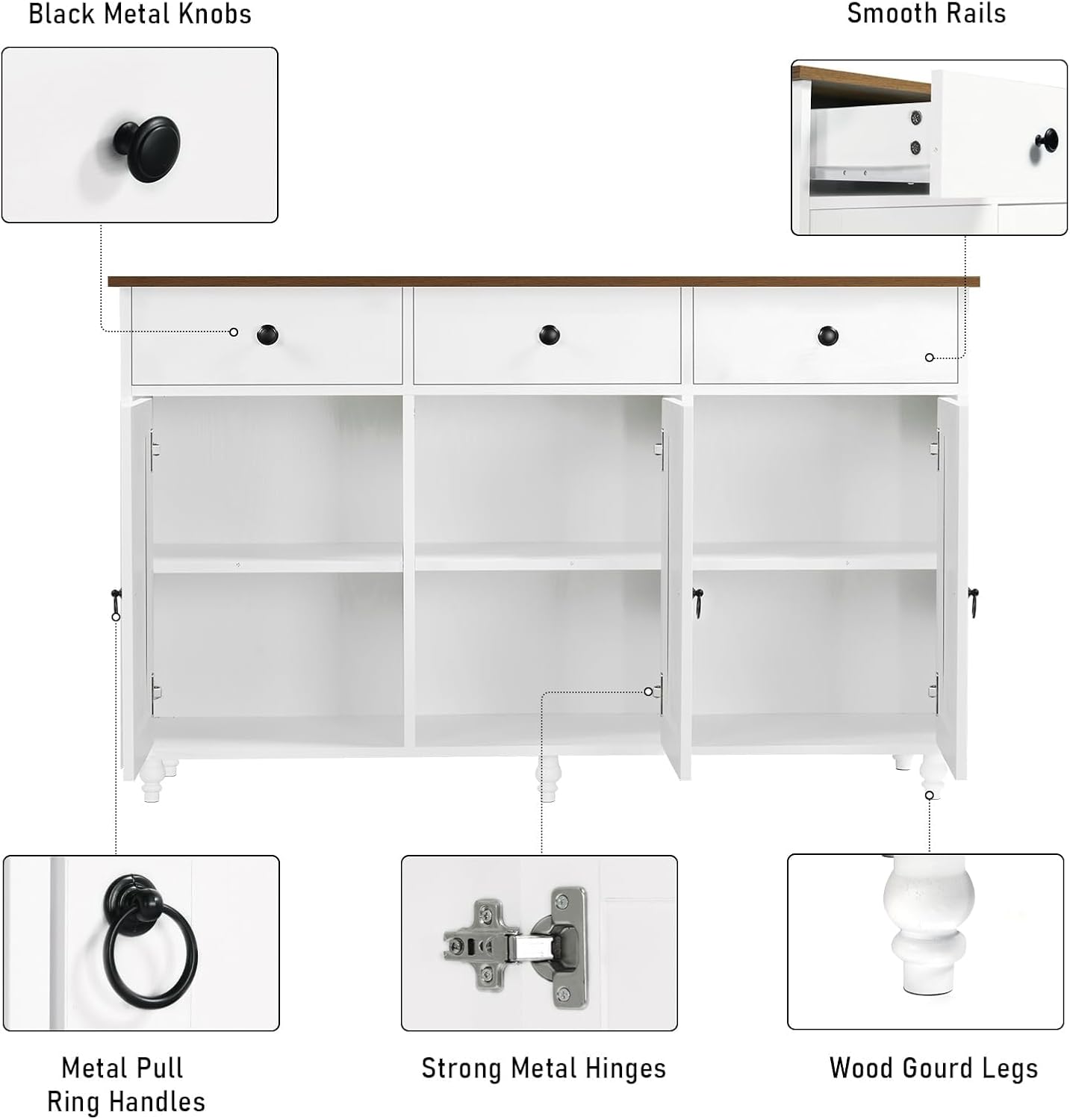 Buffet Cabinet with DrawersThe cabinet top has a vintage look, while the fashion metal handles and simple white sides modernize the sideboard and make it adaptble to a wide range of styles. Such as dining room, kitchen, living room, room light places, can add a modern flavor to your environment.The kitchen buffet cabinet can be used in different occasions not only due to its large space and versatile design style. Such as in the dining room as a kitchen cabinet in the living room as a showcase, which stores goods, the cabinet surface placed on the flower pots and other decorative in the drinking area can be used as a coffee bar in the room can be used as a desk to store books, etc., the multi-functional bookcase not only makes our space neat and orderly, but also adds a touch of brightness.Our Buffet Cabinet with Storage provides ample storage space for all your kitchen essentials. With its size of 47 inches, it features 3 drawers and 3 cabinets, ensuring that you have enough room to organize and store your items.Color: WhiteProduct Size : 15.7"D x 47"W x 30.5"HStyle: FarmhouseBase Material: engineered woodSpecial Feature: Three barn doors sideboard cabinet and Adjustable ShelvesRoom Type: Kitchen, Coffee Bar, Living Room, Classroom, Study RoomRecommended Uses For Product: kitchen cupboards, TV stand cabinet for living room, coffee bars cabinet for dining area, storage console table, entryway cabinetMounting Type: Floor MountMount