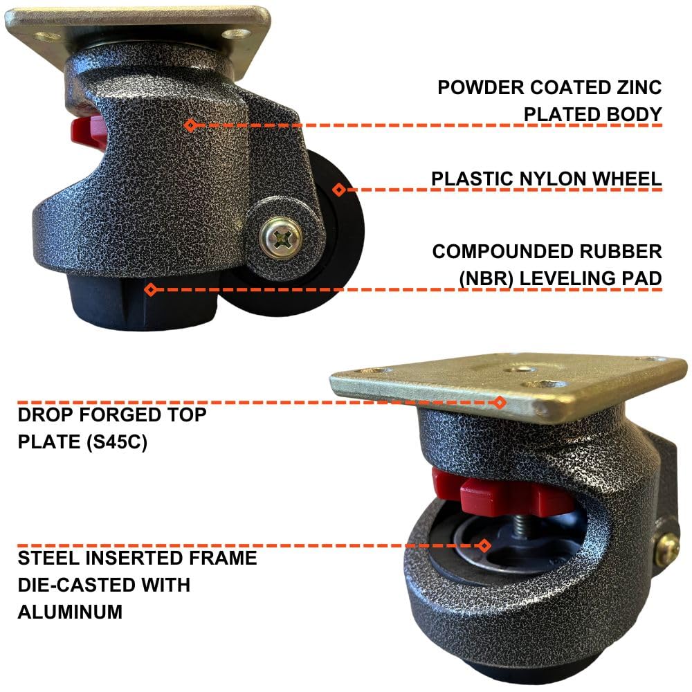 The F-Type Leveling Casters with Nylon Wheels are designed for heavy-duty applications while offering easy mobility and stability. Available in size options of 60F, 80F, and 100F, with wheel diameters ranging from 2" to 3", these casters can handle load capacities from 550 pounds to 2200 pounds depending on the model. The square top plate design and steel-inserted frame ensure reliable support, while the die-casted aluminum alloy construction adds durability for long-term use. The leveling pad, made from chemically compounded NBR rubber, provides corrosion resistance and strength, making these casters ideal for stationary and mobile setups. The wheels, injected with engineered nylon (NYLON6), deliver superior strength and smooth performance. These casters are great for medical, test, optical, and clean room equipment, as well as furniture, control panels, and lightweight computer frames.