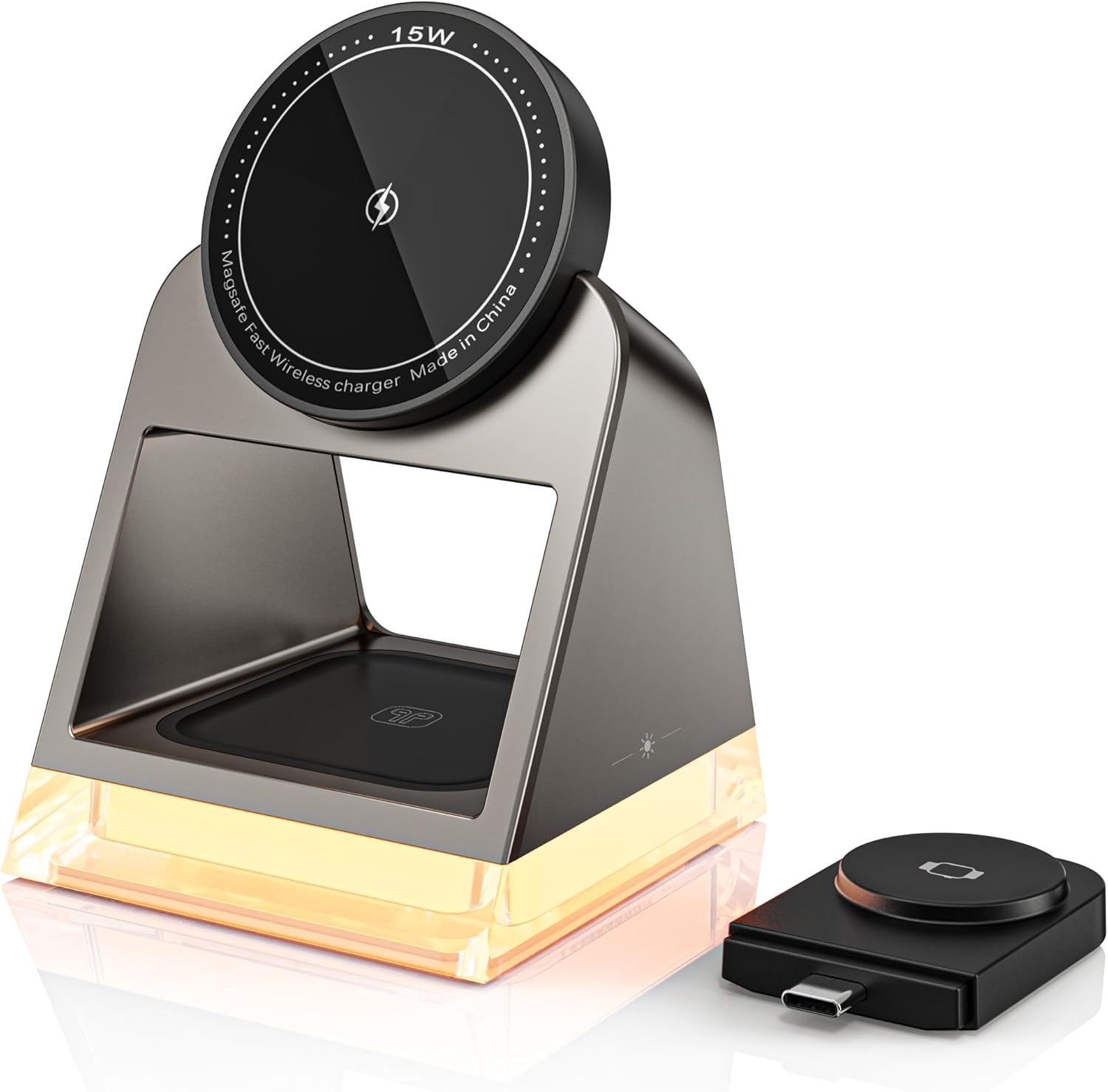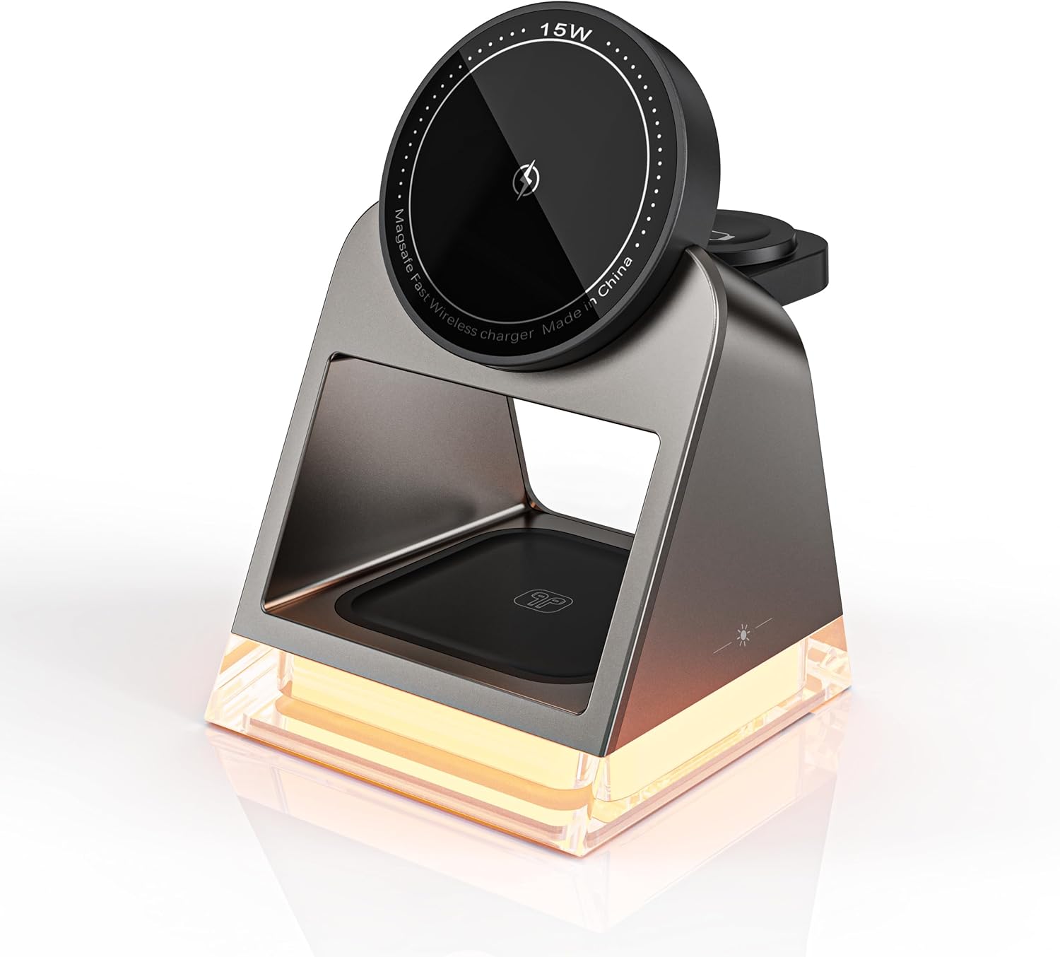 Magnetic Charging Station compatible with: iPhone, Apple Watch, Airpods & has a RGB LED Night Light. Simultaneously charge all 3 devices and use it as a night light. Once you use it, you may ask how you ever got along without it. Desktop space saver means Goodbye clutter & simplify your desktop. Included: USB Type-A TO Type-C charge cable. Power input: 9v @ 2A. Your phone/device must support wireless charging. Quick Instructions: Touch point cycles colors & turns off the LED. Keep your finger on the touch point to dim the LED.