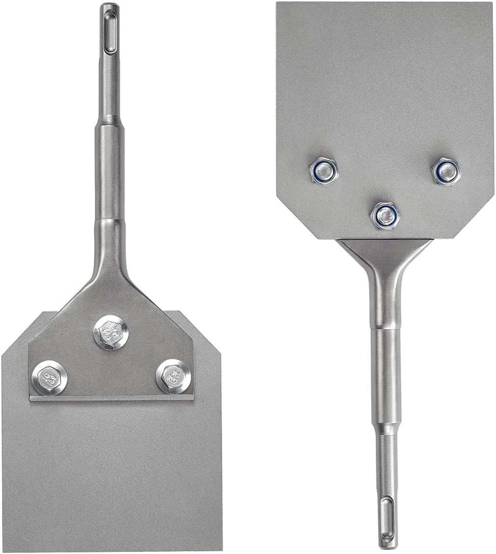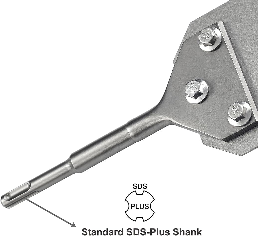 4"x10"(100x250mm) SDS-Plus Floor Scraper Package quantity: 1 piece Product length: 10" (250mm) Blade width: 4" (100mm) Shank: Standard SDS-Plus shank Material: Industrial grade high quality forged tempered steel This Floor Scraper is the perfect choice for clearing thinset and other stubborn adhesives. It works extremely well for removing Thinset, Carpet, Ceramic Tile, Epoxy, Vinyl and other stubborn adhesives. Works great also in removing the glued down wood floors and hardwood floor. With its extra wide 4" blade and light weight, it brings high efficiency, great comfort and easy operation for users. This tool is widely used by DIYers, home owners, contractors and professional tradesmen for tiles, thinset, mortar and other adhesive removing projects. Attention: It can work with only SDS-Plus rotary hammers or hammer drills. It does not fit for SDS-Max rotary hammers. Not recommend to use it for breaking concrete and tiles, but for cleaning thinset, tile and other stubborn adhesives. The blade is flex enough as much is necessary to remove the thinset, and the tiles. If the floor scarper is used properly, in certain angle the floor scraper can remove the tiles and the thinset together in one pass. The bolts may come loose after certain period of time working, We would like suggest to re-tighten the bolts right away when they are becoming loosed in order to prevent the blade from breaking in the holes area and affecting its performance. Just a small tip for the application, when you use this floor scraper, please try to avoid it from hitting any plastic and metal including nails, anchors and screws, etc. Although it may not damage the scaling blade, the resistant stress will pass back to the chisel body, plus the vibration power during the work, it may lead to breakage at the place where most stress is concentrated in the long run.