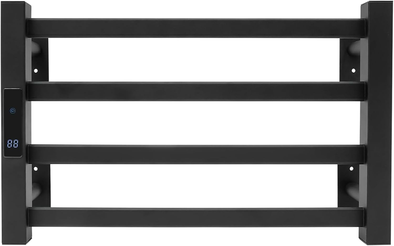 Description Towels left in damp bathrooms for too long can produce a foul odor, and lead to a series of skin problems. Our heated towel rail can solve these problems. The combination of high-class materials and exquisite craftsmanship makes it sturdy and durable. It can quickly dry your clothes and towels, keeping them away from moisture. With its generous appearance, it can embellish your bathroom.DetailsLED Display Screen: It can display temperature.Mounting Feet: Four feet with mounting holes allow you to easily install this product onto the wall.Smooth Edge: The rounded and smooth edges not only add to the aesthetics of the product but also improve the safety of use.ApplicationIt is suitable for bathrooms, kitchens, balconies, villas, hotels, etc. It can be used for drying and placing towels, clothes, etc.SpecificationColor: BlackShape: RectangularStyle: ModernMaterial: Space AluminumProcess: Plastic SprayingInstallation Required: YesMounting Type: Wall MountNumber of Tiers: 4 Timing: 24H Display Screen Type: LEDPower Souce: Corded ElectricPlug Type: US StandardAdjustable Temperature: 30-70℃/86-158℉Voltage: 115VPower: About 120WCurrent: 15ANotes 1. Please note that this product does not include towels and clothing.2. Please use this product within its load-bearing range.3. Please allow the slight color difference caused by the shooting light and 1-3cm error due to manual measurement, and make sure you do not mind before ordering.Package Including1* Heated Towel Rail1* Chinese&English ManualOther Accessories for Assembly