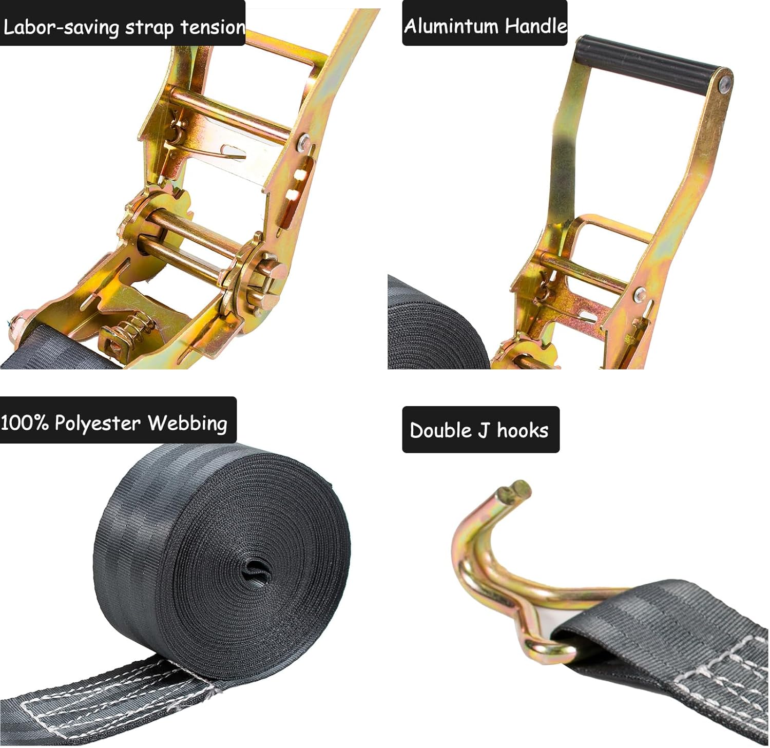 2 Inch Heavy Duty Ratchet Straps 6600lbs Break Strength, 32ft Tie Down Straps Ratchet with Double J Hook, Specification: Material: Metal, Polyester Ratchet Strap Width: 2 inch Ratchet Strap Length: 32ft Working Load: 4400 lbs / 2 tons Break Strength: 8800 lbs / 3 tons Color: Black Package Included: 4 x 2 inch Ratchet Straps with Hooks