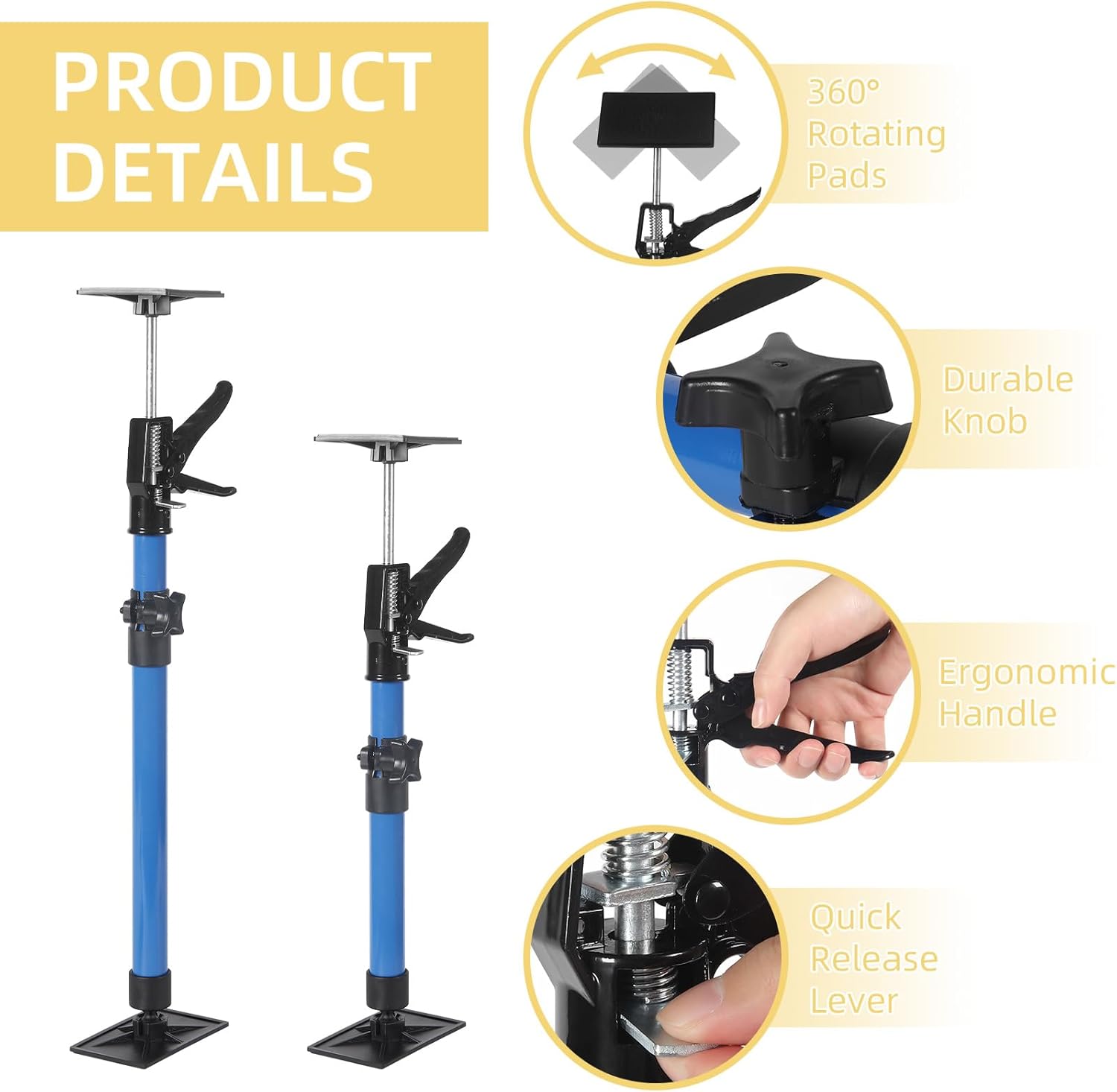 Our 4 Pack Cabinet Jacks for Installing Cabinets are made from premium thickened metal with a coated design to ensure durability. The sturdy construction ensures the support rod can withstand a weight of up to 154 pounds when supported vertically and 88 pounds when supported at a 45-degree angle. They are strong enough to hold the weight of most common building materials, just adjust to the required size, freeing your hands without additional assistance, thus saving labor costs. Specifications: Material: Metal, Aluminum, Plastic, PVC Size of Non-slip Pad: 5.0'' L x 3.15'' W Three Lengths Available: Short Rod: Expands from 11.8'' to 23.2'' Medium Rod: Expands from 19.7'' to 45.3'' Long Rod: Expands from 45.3'' to 114.2'' Maximum Load Capacity: 70KG/154LBS Application: Cabinet Installation, Drywall Lift, Door Parallel, Climbing, Crown Molding, Stair Strengthening, Ceiling/Pendant Light/Outdoor Roofing Installation, etc. Safety Tip: Each telescopic quick support rod can bear a maximum of 154 pounds. Please use multiple support rods together for a heavier load.