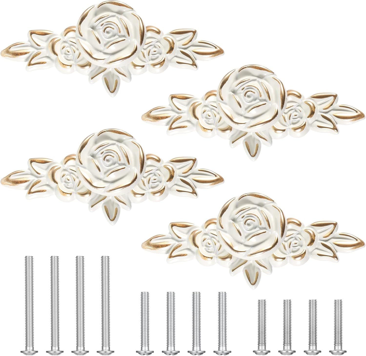 ----------------- WELCOME TO OUR SHOP -----------------Packing List: 4 Pcs Cabinet Knobs With BackplateSpecificationSize: Knobs Height 2.3cm/0.9 inch; Plate Length 10.2cm/4 inchColor: Ivory White & Gold EdgeMaterial: Zinc AlloyPackage:4× Rose Knobs with Plate4 × 0.87 inch Screws4 × 0.98 inch Screws4 × 1.18 inch Screws