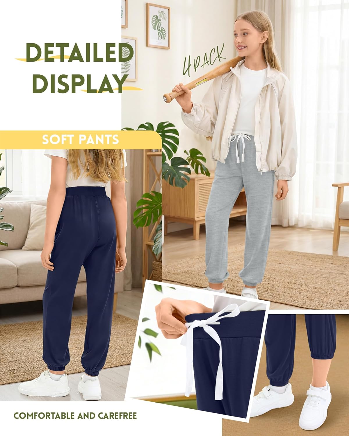 Features: Our 4 pack of girls joggers offers thoughtful present choice as a birthday, holiday surprise to your kids or other loved girls. Care for these girls pants is easy. Machine washable or hand wash with cold water, no shrinkage not easy to deform Specifications: Material: 60% Polyester, 35% Cotton, 5% Spandex Package includes: 4 Pack girls jogger pants Notes: Manual measurement, please allow slight errors on size. The color may exist a slight difference due to different screen displays