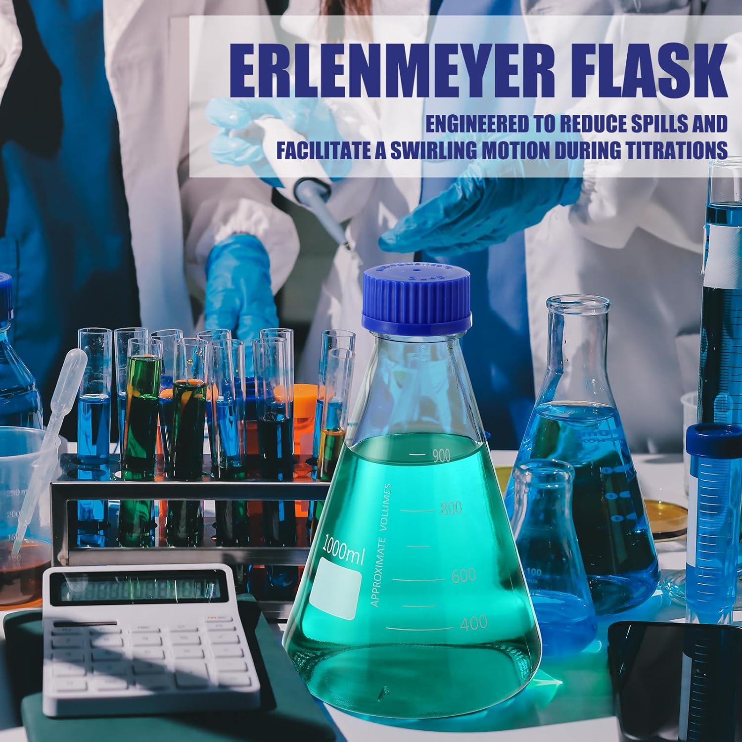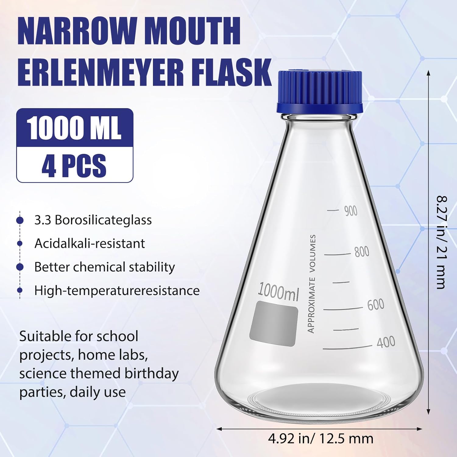 Features: Leak-proof GL45 thread cap: Each glass conical flask comes with a secure polypropylene (PP) blue threaded cap (GL45 thread) to prevent spillage, ideal for culturing or mixing. Autoclavable and reusable: These glass conical flasks can withstand high temperatures - a cost-effective long-term solution for labs and schools. Specifications: Material: soda-lime glass (neutral material) Color: Glass conical flask: clear Lid: blue Size: the bottom diameter is about 4.92 inches and the height is about 8.27 inches. Capacity: is about 1000ml Package includes: 4 x Glass Erlenmeyer flasks Notes: Manual measurement, please allow slight errors on size. The color may exist a slight difference due to different screen displays.