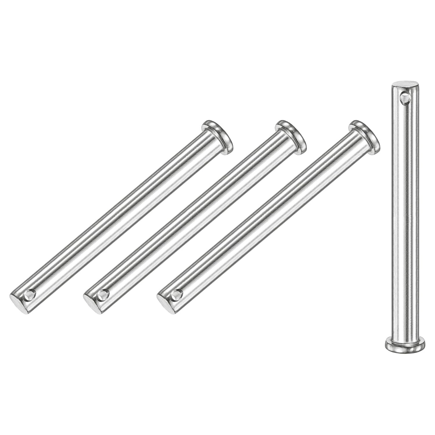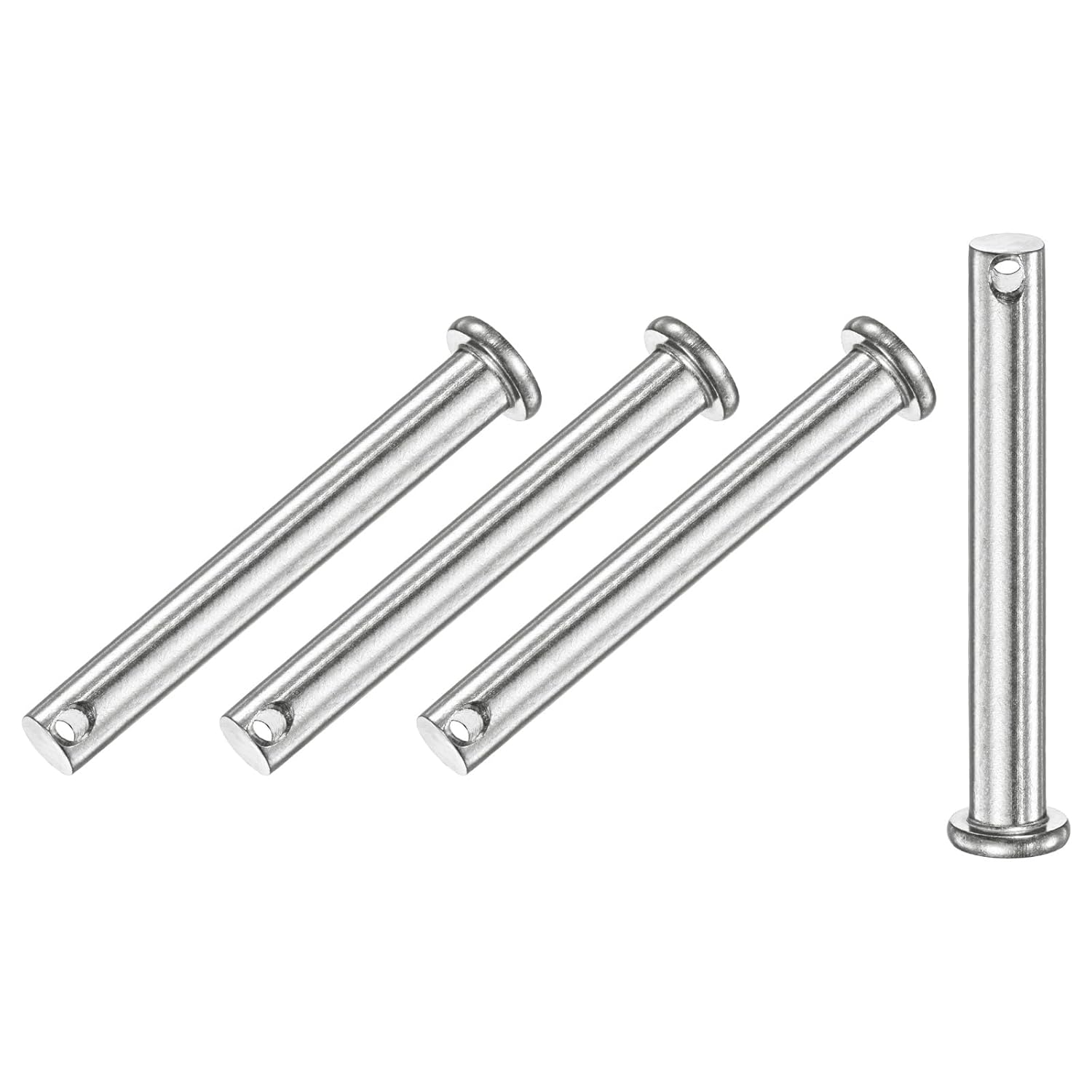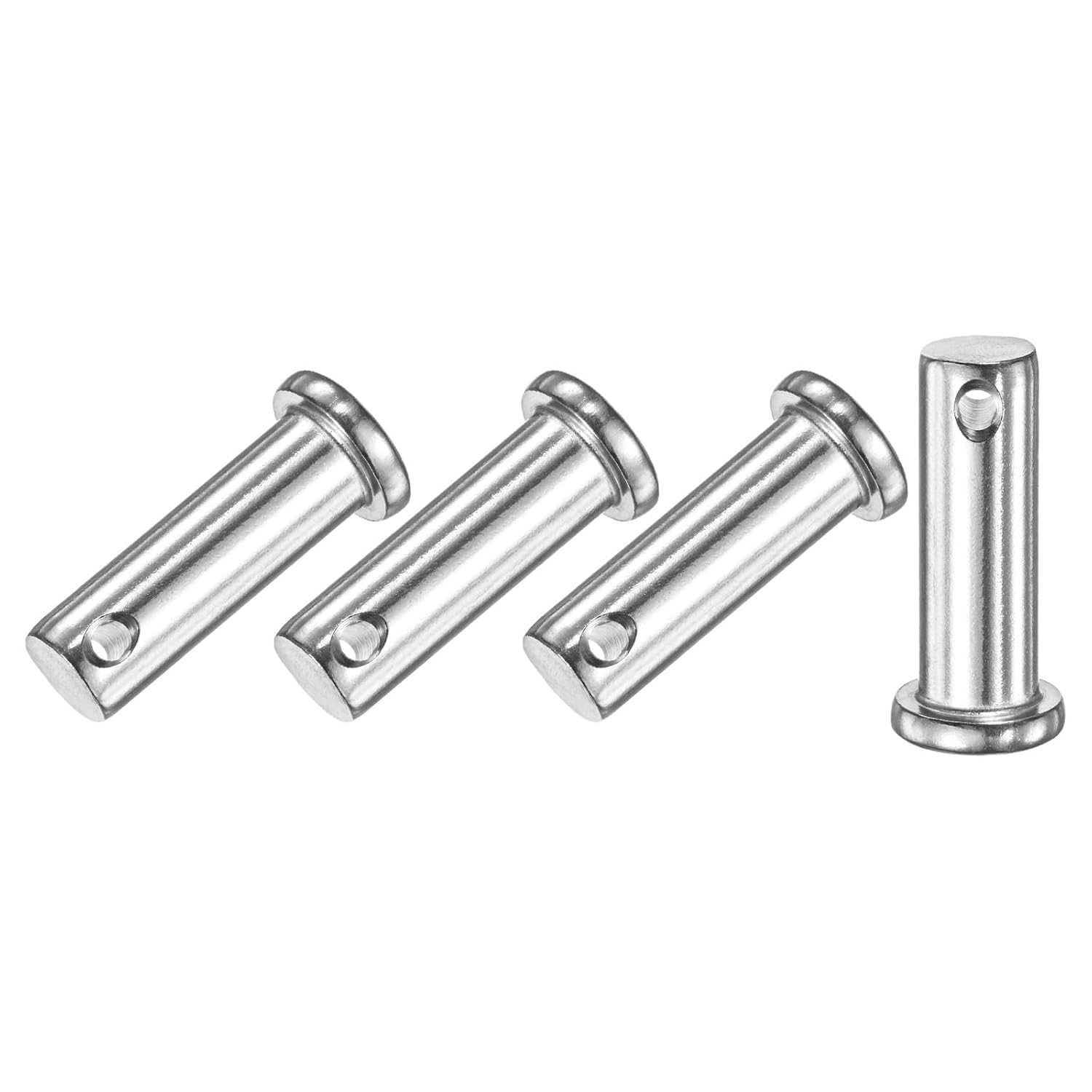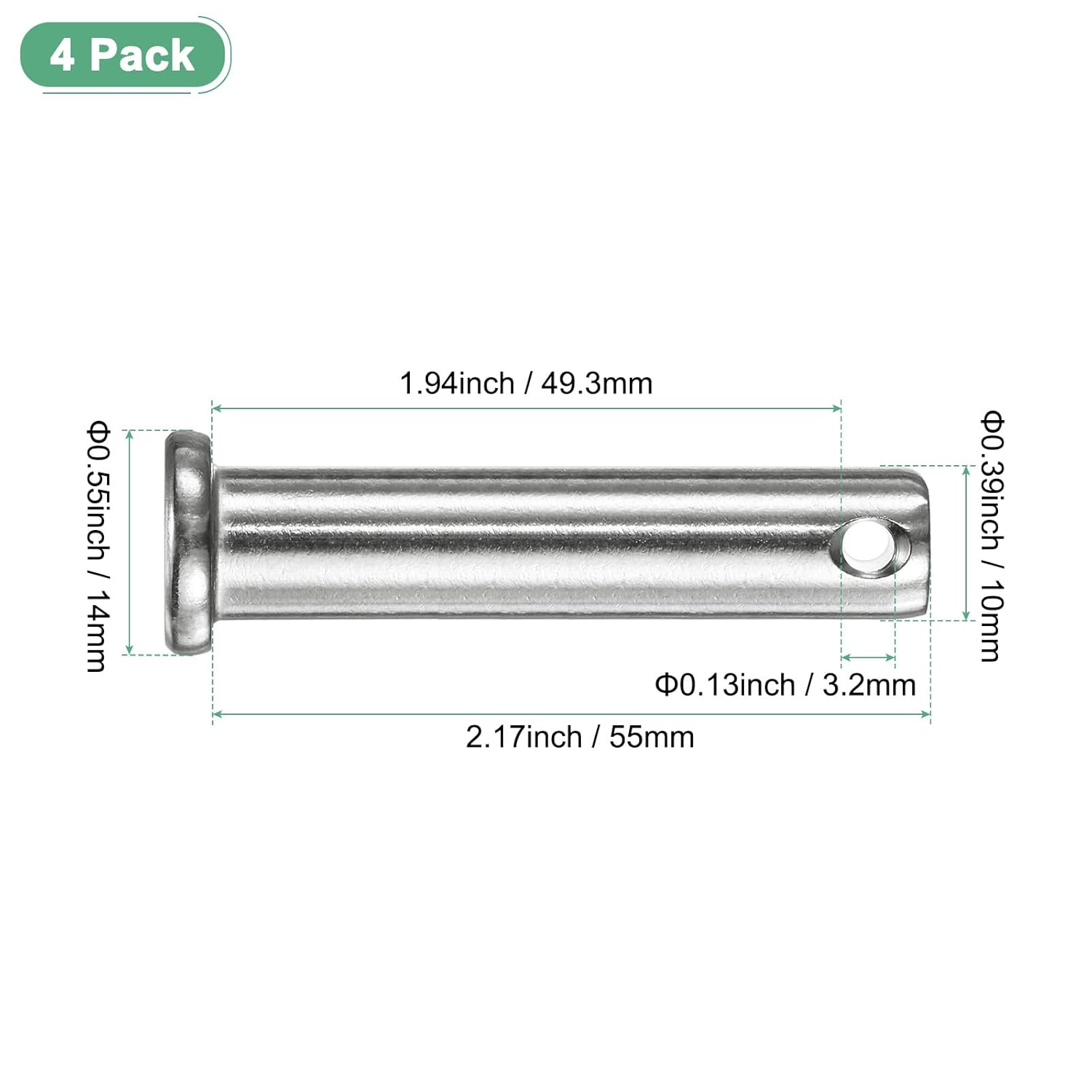 PRODUCT APPLICATIONClevis pins are used in agriculture, and construction industries, such as mechanical linkages, trucks, suspend, fastening hinges, fixing parts, rigging and lifting gear, ship rigging, lawnmowers, etc. They facilitate quick assembly and disassembly of components.PRODUCT DETAILS√ Type: Clevis Pins√ Material: 304 Stainless steel√ Rod Diameter: 0.39 inch/ 10mm√ Rod Effective Length: 1.94 inch/ 49.3mm√ Aperture: 0.13 inch/ 3.2mm√ Pin length: 2.17 inch/ 55mm√ Head Diameter: 0.47 inch/ 12mm√ Package Includes: 4 Pcs x Single Hole Clevis PinsPRODUCT ADVANTAGES1. The clamp pins are made of 304 stainless steel, which is highly resistant to corrosion and heat and has high tensile strength, hardness, and toughness. They can be fully trusted and used for a long time.2. There is a hole at the end of the chuck, through which you can pass the split pin to stabilize your accessories, and the clevis pin can absorb lateral stress and tension very well, giving your fasteners a secure fastening. INSTALLATIONInsert the clevis pin into the aligned holes, making sure it goes all the way through and is flush with the assembly, using a cotter pin or bridge pin to hold the clevis pin in place. Insert the pin into the hole on the clevis pin and bend the ends to prevent it from sliding out.