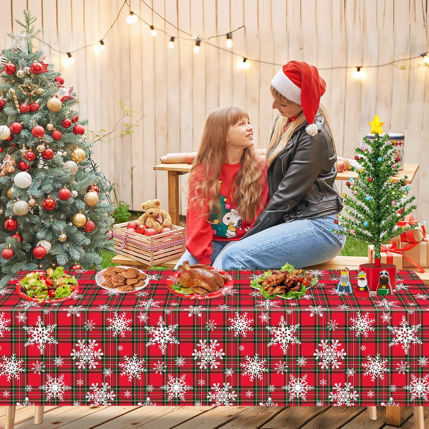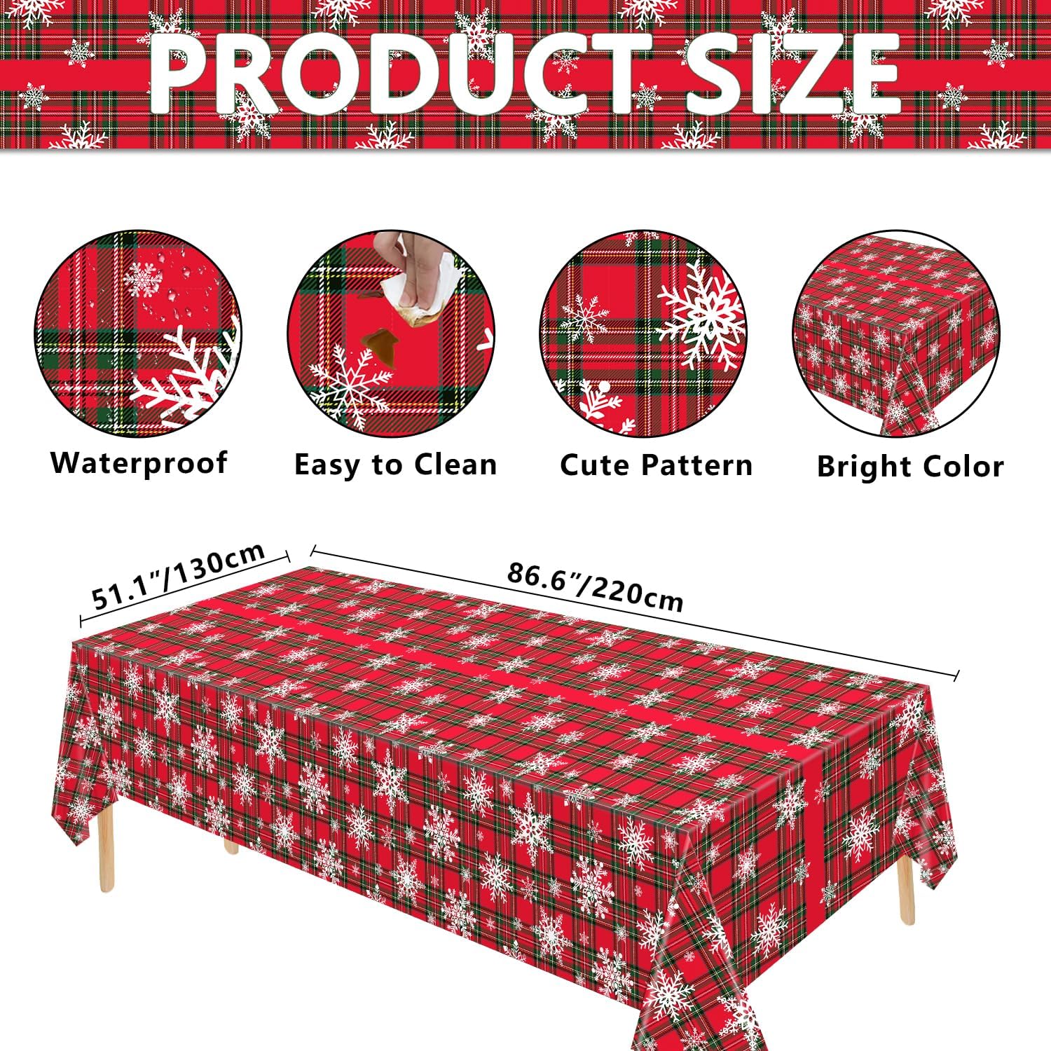 Oil and water-resistant white snowflake on green and red plaid PE tablecloths can help you keep your table clean. You can use the beautiful and eye-catching white snowflake party table cloth to decorate your desk or table. Package Includes: 4 x snowflake tablecloths Product Size: 51x 86''/130 x 220cm
