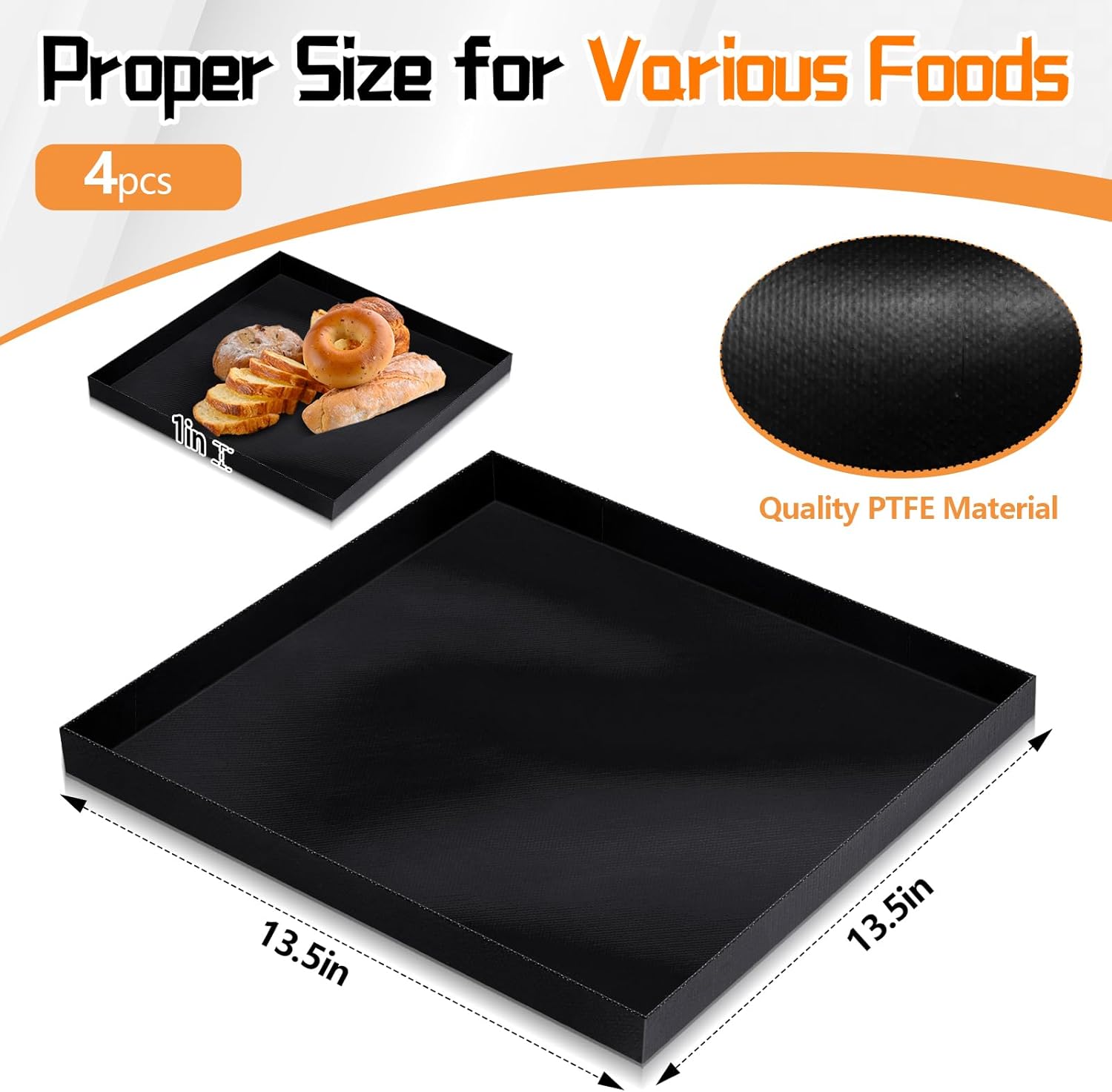 Features: The sleek black color of our toaster oven tray not only makes it a stylish addition to any kitchen, but also offers professional appearance for commercial use. Whether placed in a fast food restaurant, cafe, or home kitchen, this oven basket enhances your kitchen aesthetics while providing practical functionality. We understand your need for reliable and efficient kitchen tools. Our oven basket offers you solid trust, knowing it will serve you optimally, and you can use it for a long time. Specifications: Material: PTFE Color: black Size: about 13.5 x 13.5 x 1 inch Package includes: 4 x Oven basket Notes: Manual measurement, please allow slight errors on size. The color may exist a slight difference due to different screen displays.