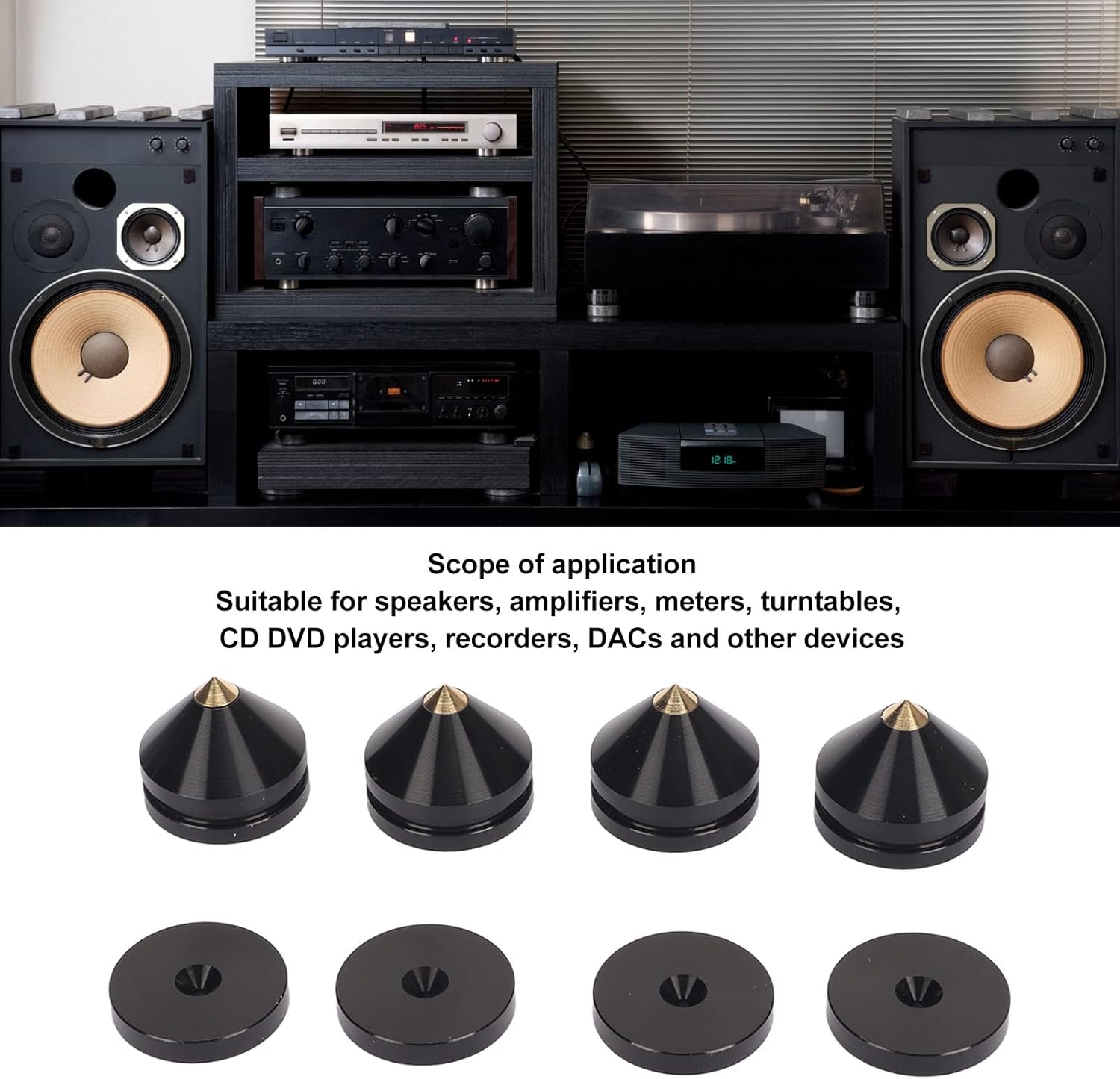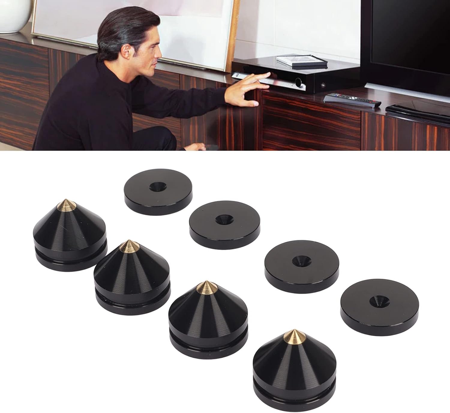 Spec:Item Type: Speaker Isolation Feet PadsModel: SP2724Material: Aluminum AlloyQuantity: 4 Sets (4 Foot Spikes, 4 Foot Pads)Foot Spike Height: Approx. 20mm/0.79inFoot Spike Diameter: Approx. 24mm/0.94inFoot Pad Diameter: Approx. 23mm/0.91inFoot Pad Height: Approx. 4mm/0.16inSuitable: Speakers, Amplifiers, Meters, Turntables, CD DVD Players, Recorders, DAC And Other EquipmentHow to Use:Install and usePackageList:4 x Foot Pads4 x Foot SpikesNotice:Please allow some error due to manual measurement.